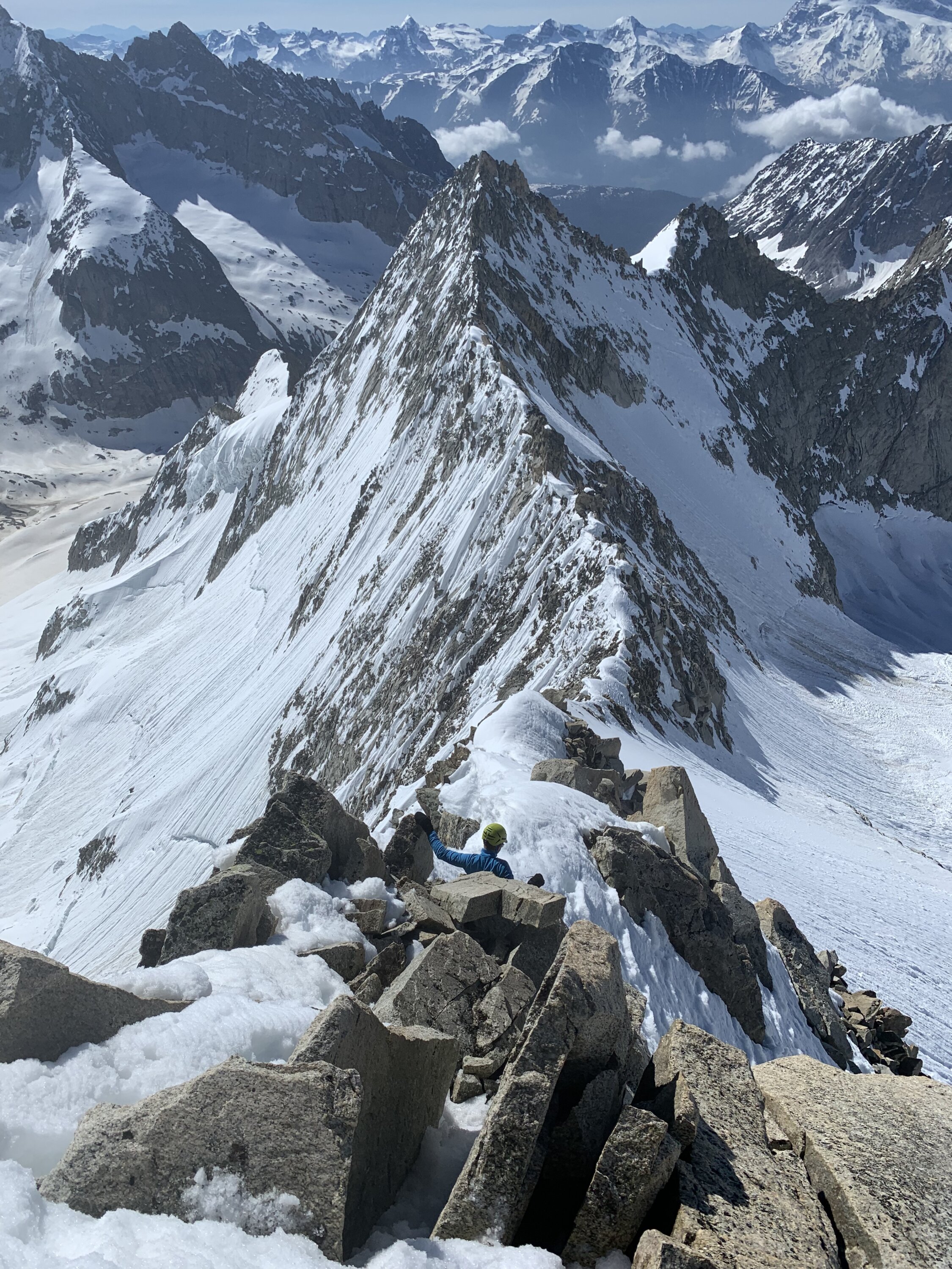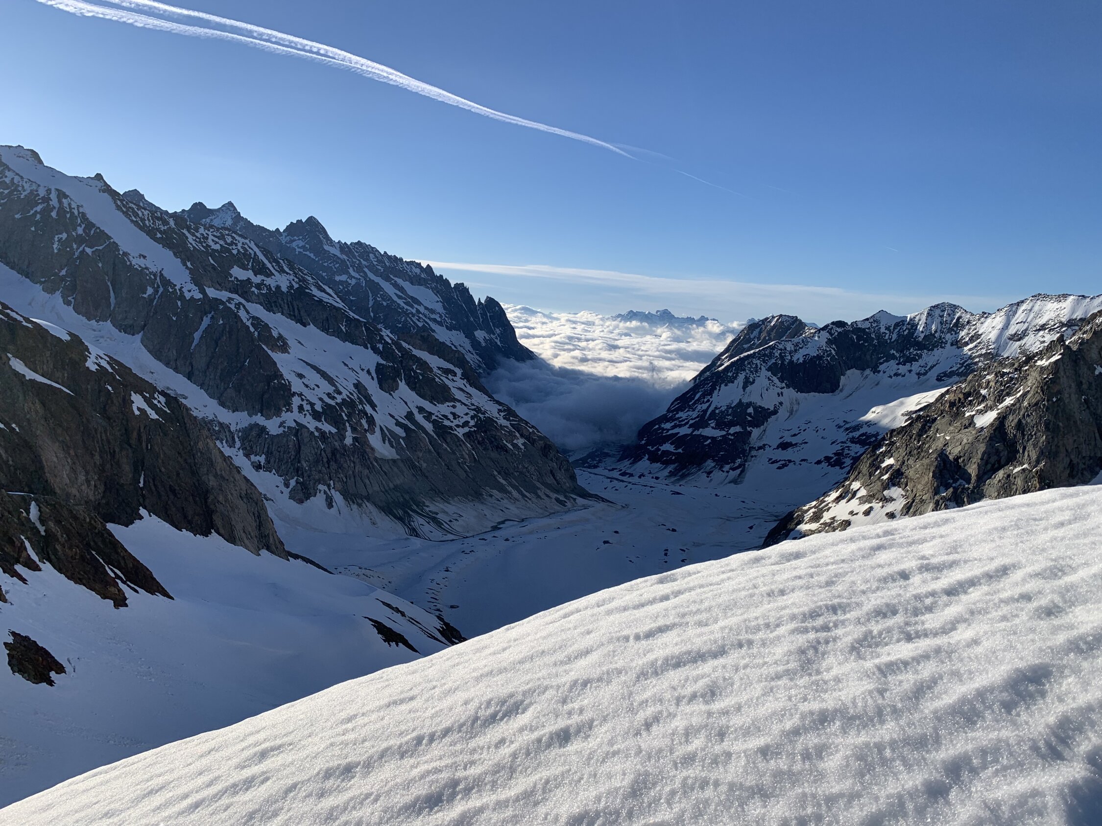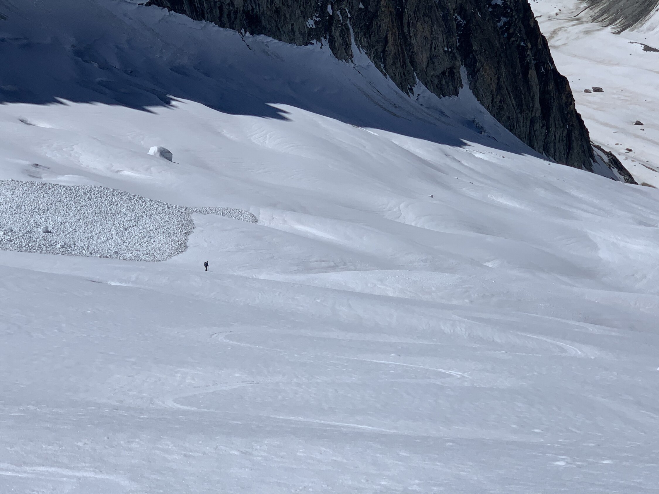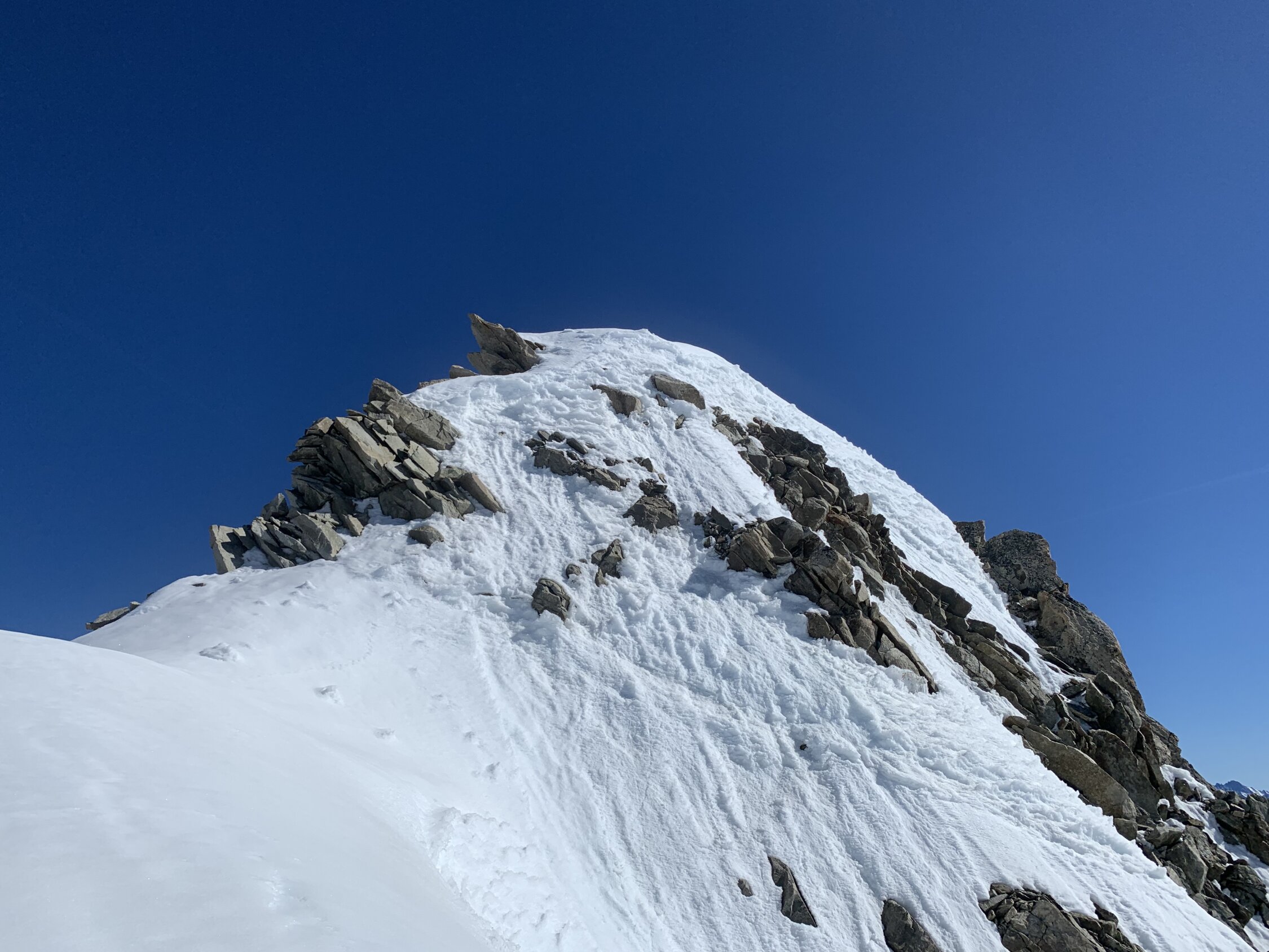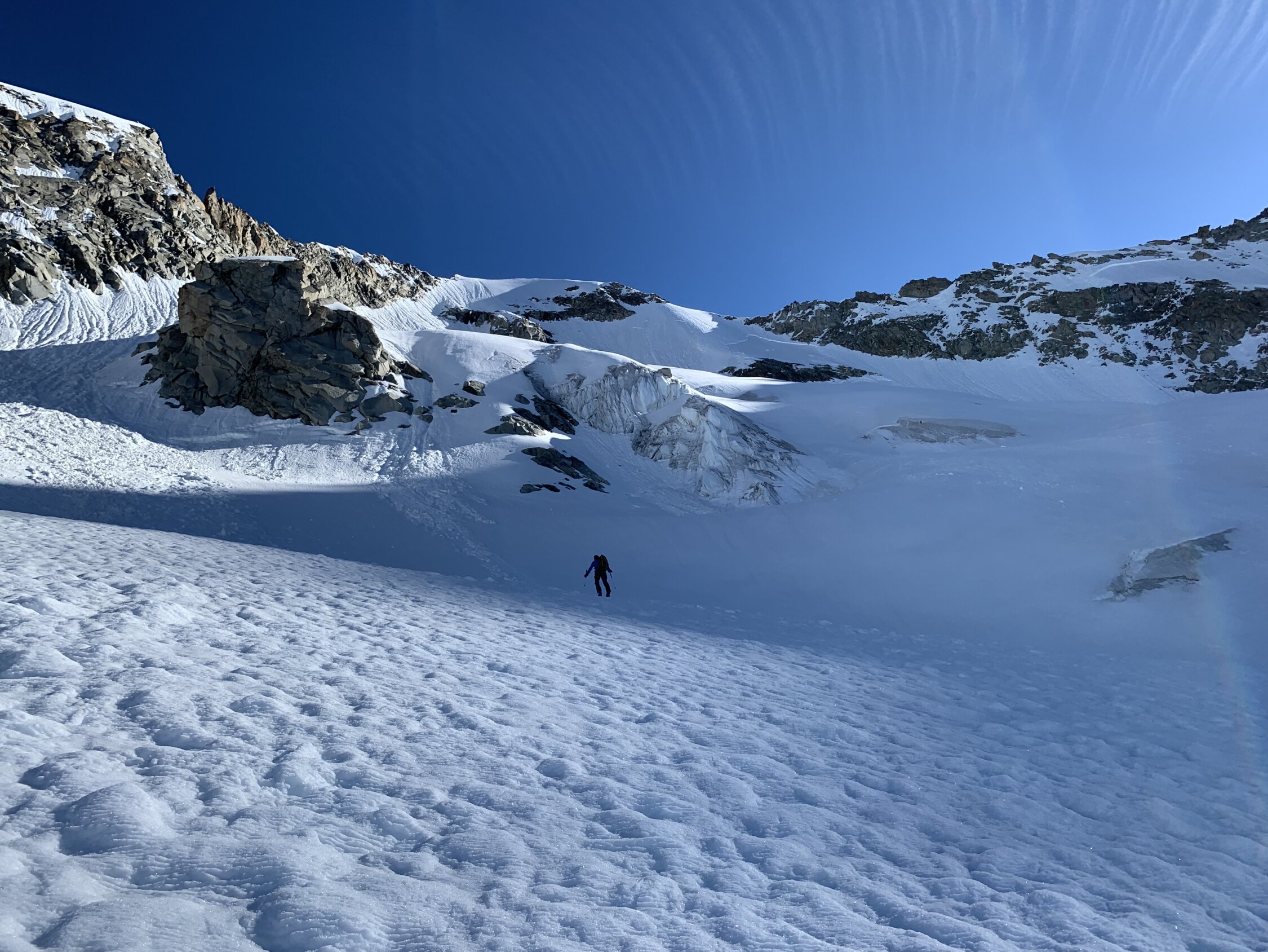 Je nach Sichtweise kann man alles zwischen ausgezeichnet und machbar geben. Ausgezeichnet, weil man Mitte Juni nach 30 min Skitragen bereits auf Ski umsteigen kann, das Wetter perfekt war (stahlblauer Himmel, gute Abstrahlung, praktisch windstill) und alle südseitigen Gletscher morgens perfekt tragend waren. Keinerlei heikle Spaltenbrücken, Gipfelaufbau in sehr gutem Trittschnee machbar. Ausser Pickel & Leichtsteigeisen war kein zusätzliches Material notwendig.