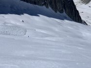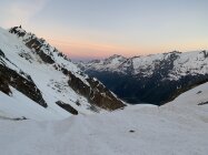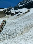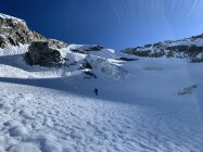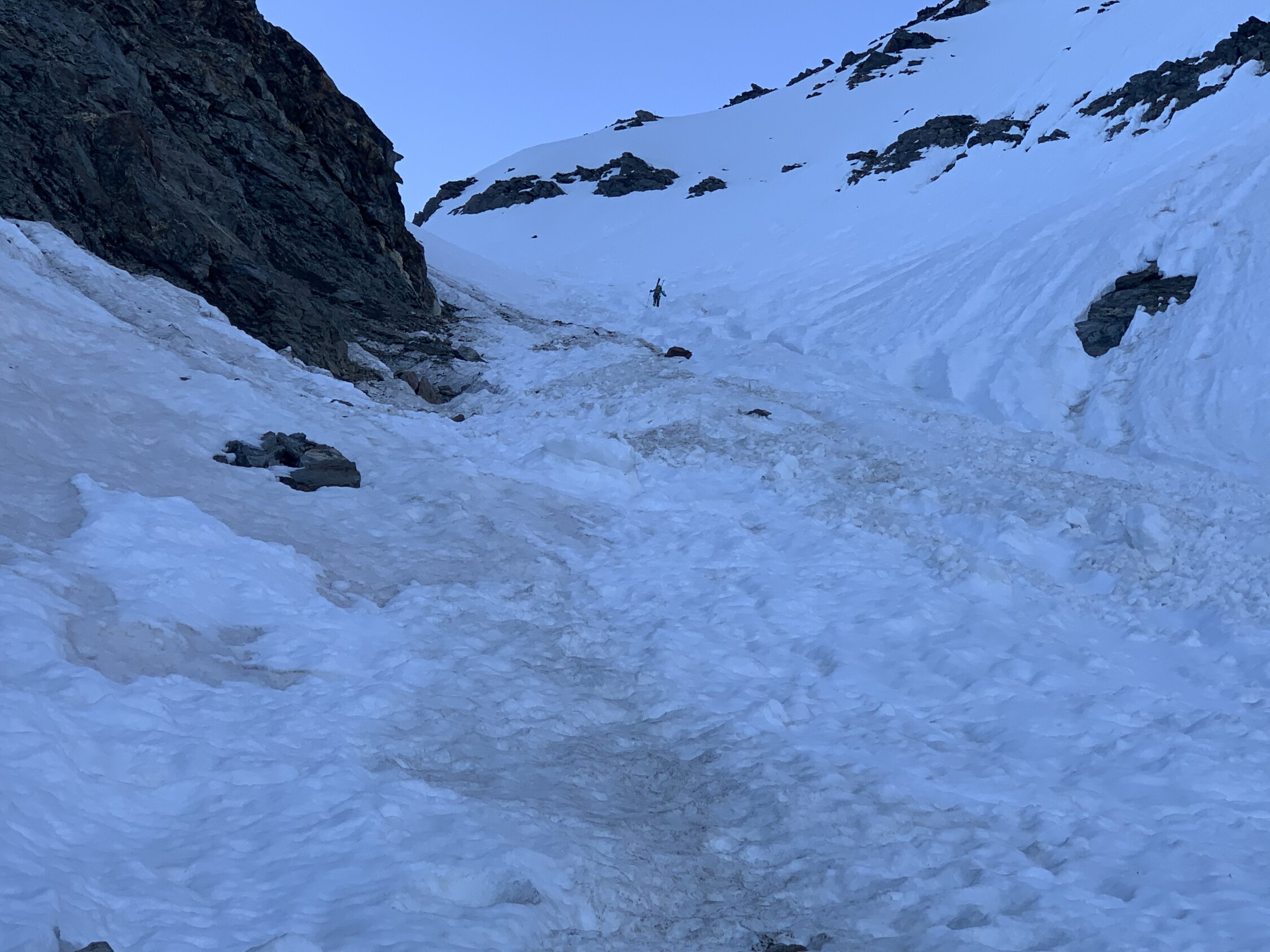 Machbar, weil ab 2200 m nordwestseitig bis zum Ausstieg Beichpass praktisch der gesamte Aufstieg (und entsprechend auch die Abfahrt) über gigantische Lawinenabgänge stattfindet. Es ist praktisch alles mit Lawinenbollen, Steinen und teils bis zu 2 m (!) tiefen Lawinenrunsen bedeckt. Im Aufstieg noch ok, in der Abfahrt dann mühsam und gefährlich, da aufgrund des durchweg steilen Geländes, welches nach unten über Felsstufen ausläuft, eine erhebliche Absturzgefahr besteht, insbesondere, wenn das Gelände noch nicht ausreichend durch Wärme/Sonneneinstrahlung aufgeweicht ist. Für die Abfahrt sollte der Schnee daher bereits weich sein, wartet man jedoch zu lange, setzt man sich einer zunehmenden Steinschlaggefahr aus den östlichen Begrenzungsfelsen aus.