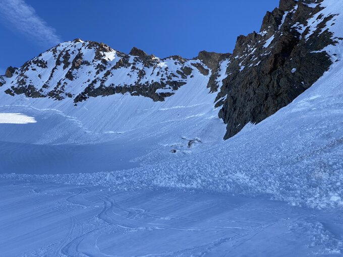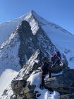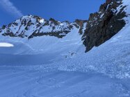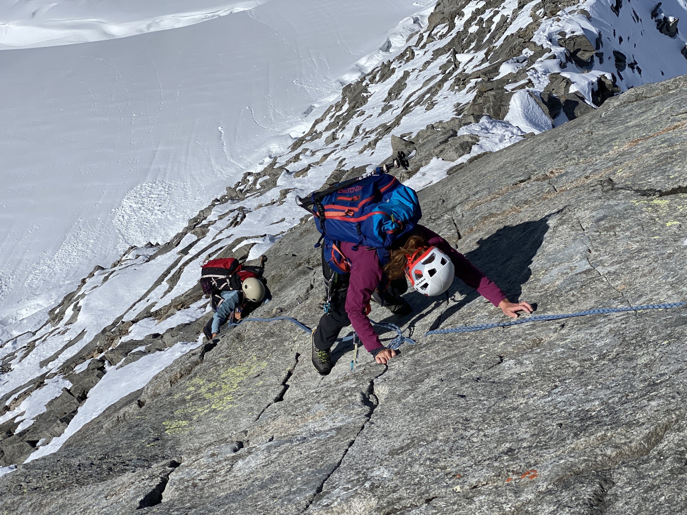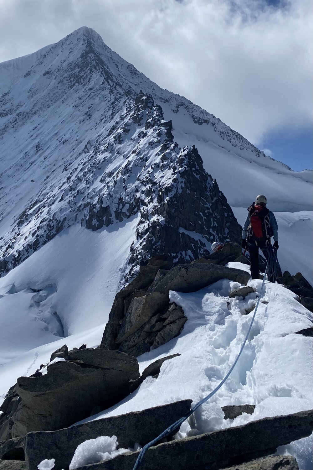 Durch den Schneefall vor zwei Wochen liegt auf dem Gletscher etwas Schnee und auch der Grat ist auf der Nordseite gezuckert. Alle Spalten sind noch gut sichtbar. Der Grat selbst lässt sich sehr gut begehen. potentielle Sicherungsmöglichkeiten und die böse Platte sind schneefrei. Einzig der Abstieg in die erste Scharte und der Aufstieg aus der zweiten Scharte sind etwas unangenehm zu begehen, da rutschig und schlecht absicherbar.