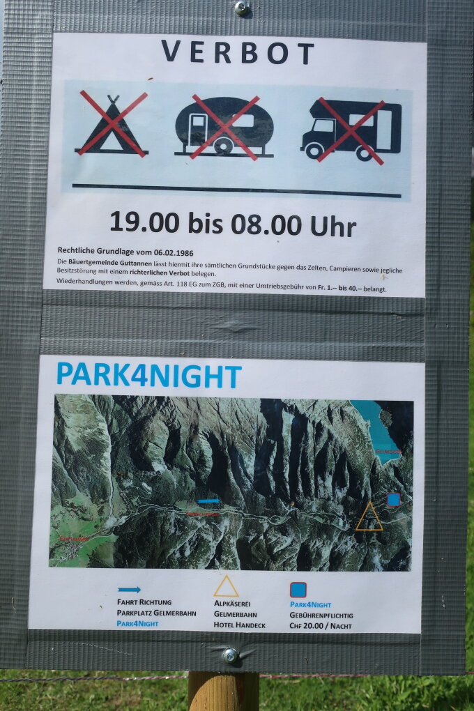 Info zum Wildcamping: Neu gilt ein Übernachtungsverbot auf den grossen Parkplätzen, ausser für Fr. 20.- auf dem Platz der Gelmerbahn bei der Handegg.