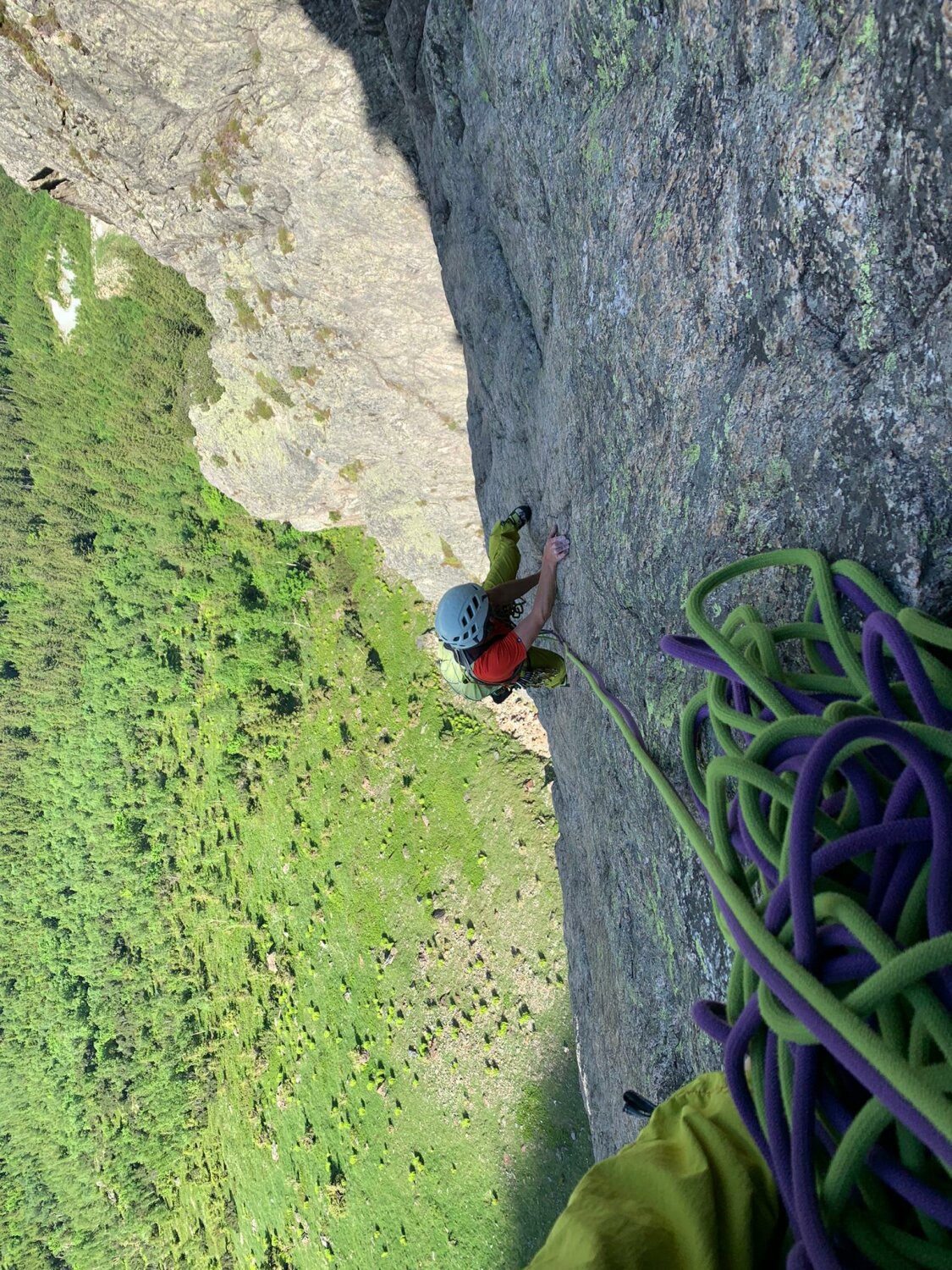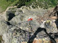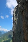 Eindrückliche Route mit zwingenden Passagen. Friends 0,5 oder mittlere Keile manchmal hilfreich. Vorsicht auf Seilzug.