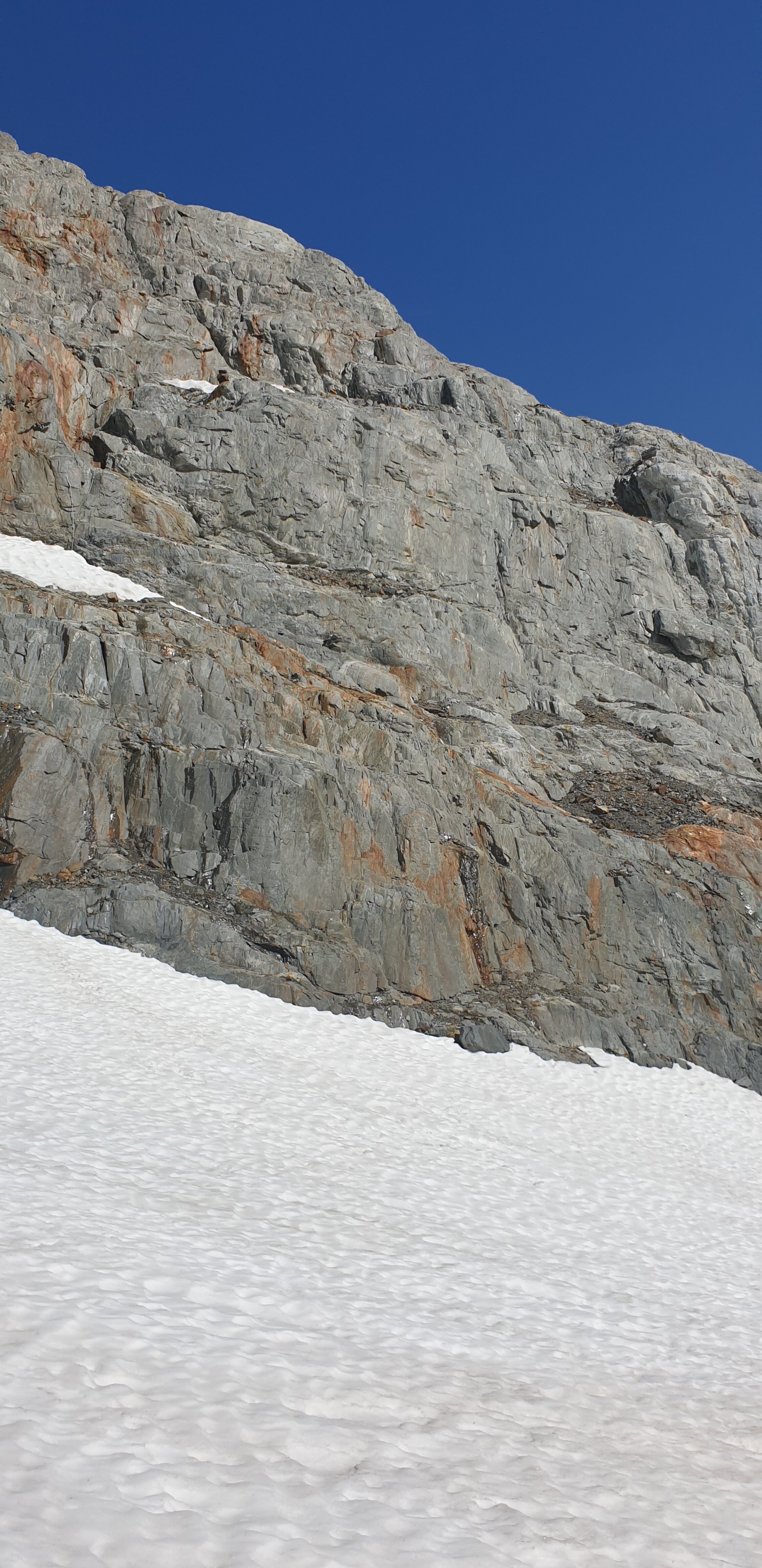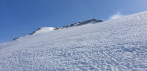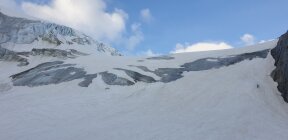Ab 3000 die obersten 30cm gefroren, darunter Sommerschnee. Genug Schnee am Parkplatz, allerdings wird sich der Bach im Tal bald mal öffnen. GLETSCHERBRUCH am Talende nicht ohne, es liegt einiges an Eis herum. Man ist ca. 10 min in der Gefahrenzone beim Aufstieg wenn man sich ganz rechts hält. Gletscher dann am Anfang schon einige blanke Stellen, bin daher über den Grat augestiegen.