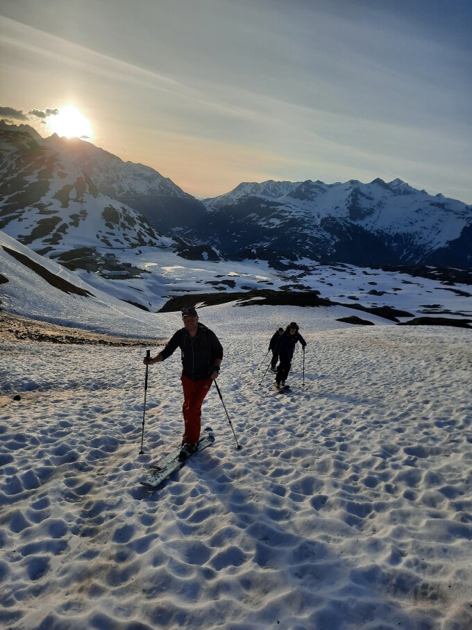 start 6.00 hat gepasst heute,fast keine abstrahlung in nacht,aber untergrund gut tragend.mit ski von parkplatz bis gipfel.abfart leicht bremsender sommerschnee,aber gut zu fahren.abfahrt tribetsee auch noch gut.
