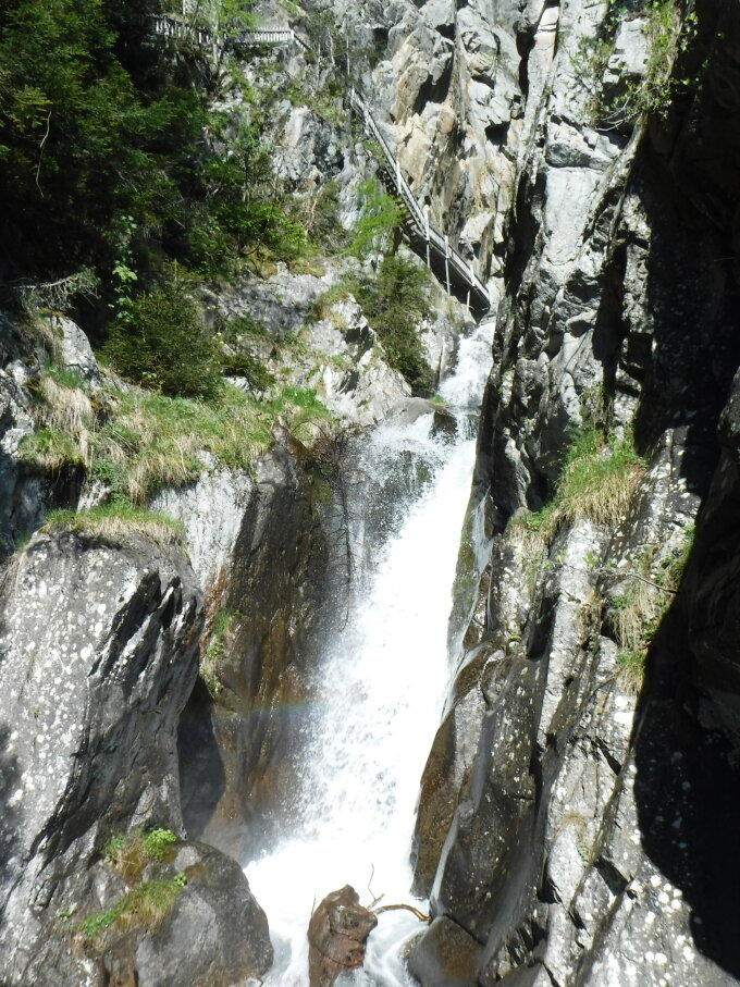 Der Treppen- und Stegeweg durch die Dailley-Schlucht (Gorges du Dailley) ist im oberen Abschnitt durch Steinschlag erheblich zerstört worden. Hierauf weist keine Nachricht an der Info-Tafel am Parkplatz von Les Granges hin. Die Wegsperre ist auch (noch) nicht in aktueller swisstopo-Karte markiert. Ab oberer Brücke ist dieser Schluchtweg gesperrt. Man kann auf rechter Seite (in Aufstiegsrichtung) bis dorthin die Schlucht noch hinauf und dann auf linker Seite retour. Von oberer Straßenbrücke Van d’en Bas ist der Weg von Anfang an gesperrt. Die steile Treppe zum Klemmblock hinauf hat es komplett weggerissen. Im luftigen Quersteg vom Klemmblock zum Ausstieg hat es den Holzboden komplett durchschlagen. Es steht noch viel Reparaturarbeit bevor. Ein 8 mm Sicherungsseil ist an den genannten Stellen zum Sichern für die Arbeiter angebracht. Man kommt nur kletternd da durch. Einiges an Baumaterial wurde dort schon hingebracht.