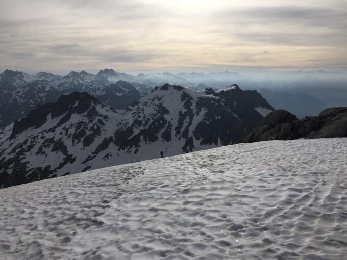 Start mit Ski ab der Gotthardpassstrasse auf einem durchgehendem Schneeband noch möglich. Aufgrund der milden Nacht war der Schnee nicht ganz durchgefroren, die Harscheisen konnten im Rucksack bleiben. Auch der der Aufstieg vom Skidepot zum Gipfel über den derzeit schmalen Scheegrat war ohne Steigeisen gut möglich.
