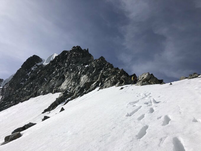 Super warm, der Schnee ist 18. auf 19.6. trotz klarer Nacht nur oberflächlich angefroren. Wir sind so tief eingebrochen, dass wir umgedreht sind ca 2 SL vor der Eisnase.