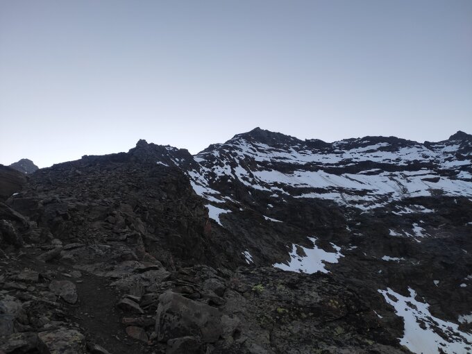 Schneefeld vor dem WSW-Grat kann gut durch Überqueren des Abflusses/Baches des Lagginhorngletschers vor dem Schneefeld vermieden werden (Einbruchgefahr).