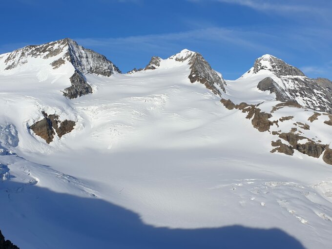 Es hat noch viel Schnee... Hüttenweg noch mit einigen Schneefeldern aber gut machbar. Wir sind übern Dossengrat aufgestiegen,fast schneefrei und trocken. Leider über Nacht keine Abstrahlung (5 Grad um 4 uhr) und der Schnee war ab 9uhr bereits so weich, dass man auf dem Gletscher z.T. bis halb knietief eingebrochen ist oder bis über Oberschenkel im Schnee einsank (Dossenfirn). Wir waren ohne Schneeschuhe unterwegs, haben gespurt und uns für die kurze Tour aufs Ränfenhorn entschieden und sind danach gleich weiter ins Rosenlaui abgestiegen.