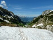 Der Höhenweg zur Saxerlücke ist mittlerweile komplett schneefrei. Auf der Route zum Mutschensattel hat man erst oberhalb der Hütten der Roslenalp ersten Schneekontakt. Unter dem Mutschensattel liegen noch einige Schneefelder, die aber bei diesen Temperaturen gut begehbar sind.