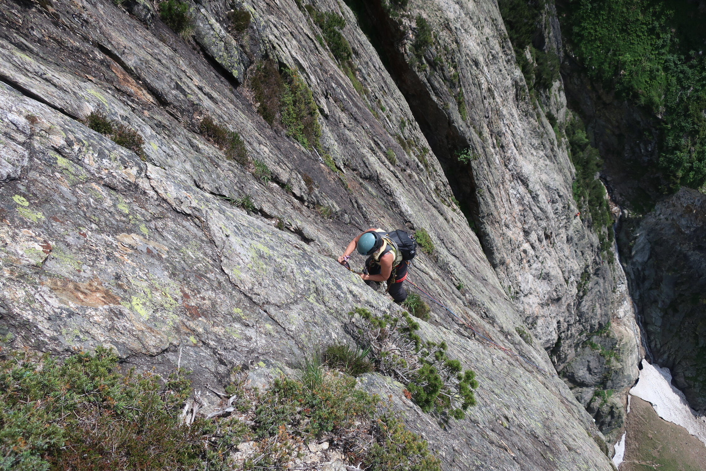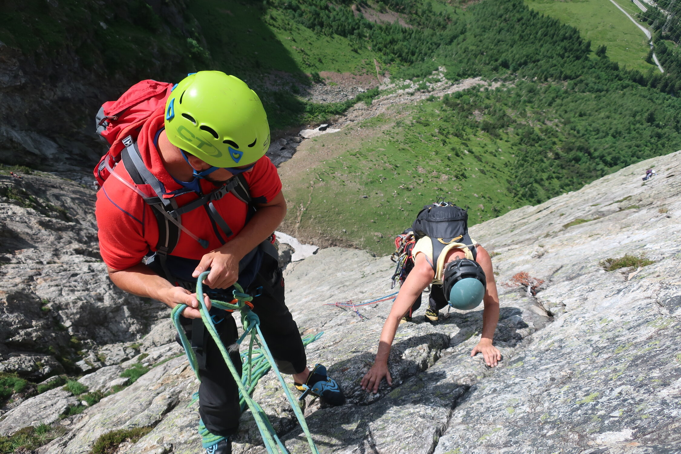 Wer hat, soll ruhig mit einem 60m Doppelseil anreisen, es hat einige 50m+ Seillängen... Und unbedingt auf Verlängerungen bei der Seilführung achten, oder konsequent Halbseiltechnik anwenden. Sonst droht immer wieder unglaublicher Seilzug!