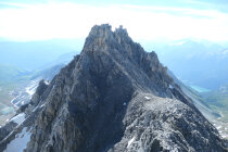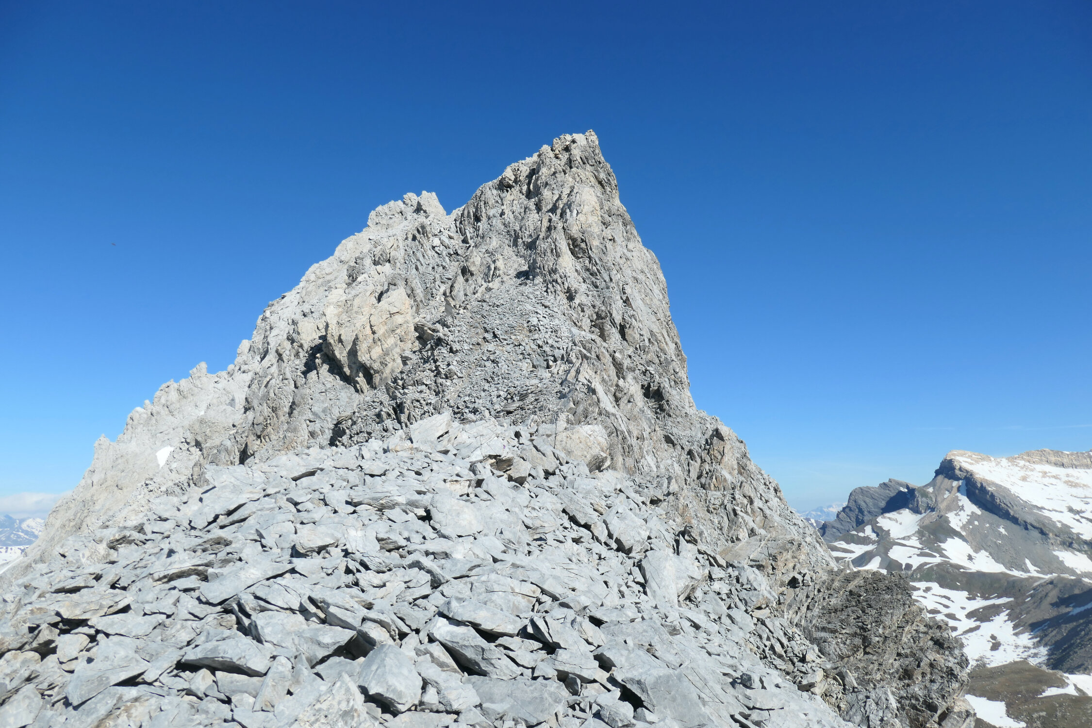 Nach Erreichen des Gipfelgrates bin ich erst mal zu weit anch oben, da steht man bald an einer für mich nicht frei abkletterbaren Einschartung. Wegfindung der Traverse in der oberen Südwand ist anspruchsvoll, es gibt sicher Varianten, aber das Gelände ist unübersichtlich, musste mehrfach "suchen". Gipfelbuch müsste mal getrocknet werden, Schneeschutz-Dose war nicht geschlossen. 2. Eintrag im 2021.
