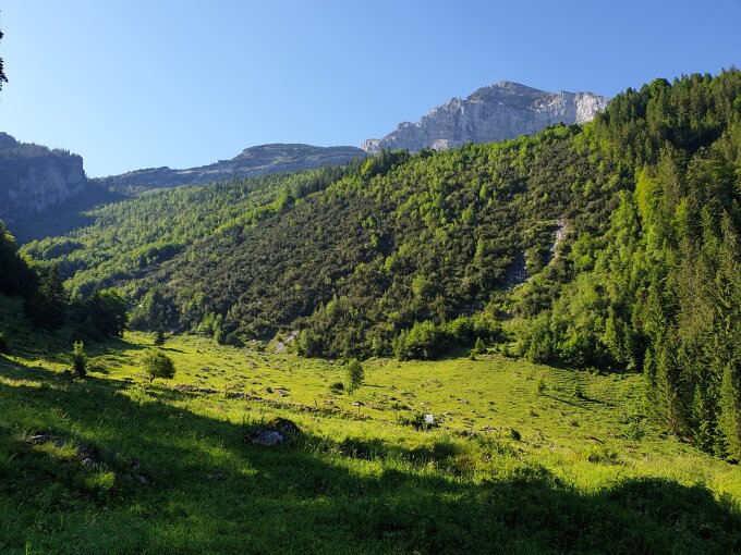 Trotz noch feuchten Tritten mit festen Schuhen gut machbar. Kletterstellen auch mit Bergschuhen möglich, dann sind sie vielleicht etwas höher zu bewerten. Abstieg via Grapplialp steinig, teils speckig und deswegen etwas mühsam.