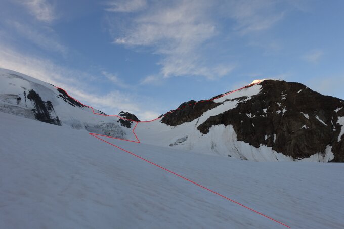 Spalten am Gletscher sind zu, Bergschrund unterhalb des Monte Pasquale noch gut zu überwinden, wird heikler bei Temperaturanstieg!