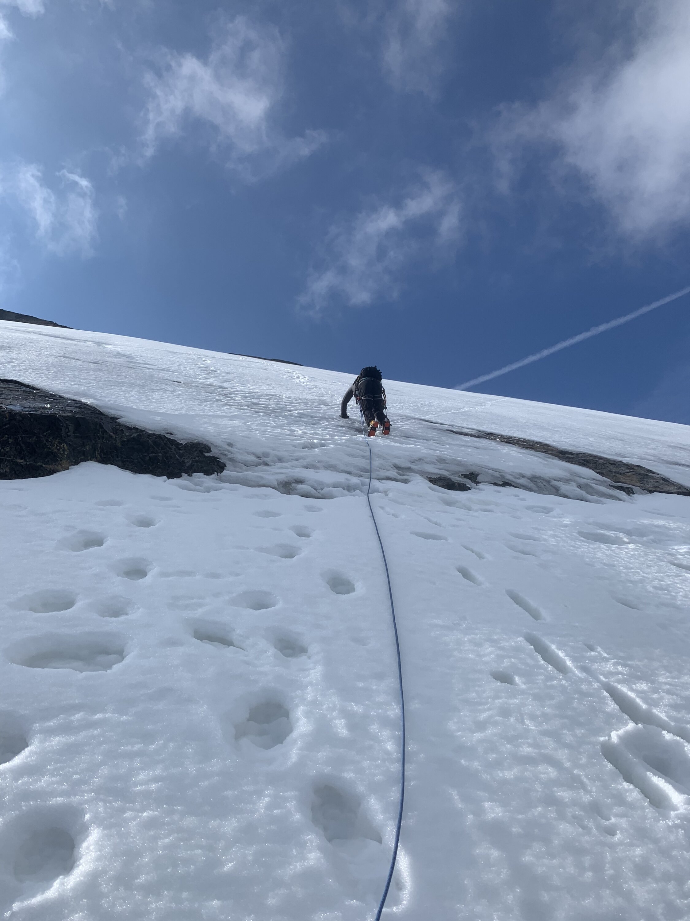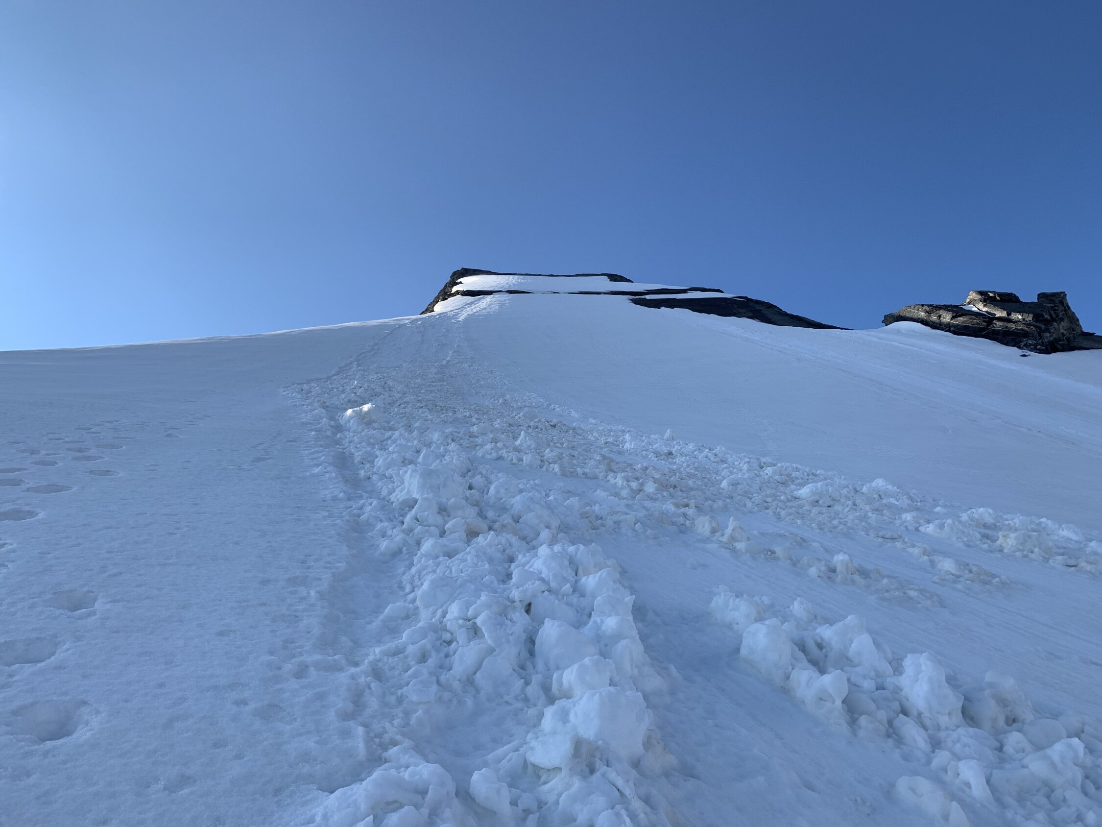 Am Vorabend noch ein kräftiger Regenschauer, Aufklaren erst in der zweiten Nachthälfte. Entsprechend warm und nicht durchgefroren. Fründengletscher ohne Steigeisen begehbar, kein Einsinken. Felsteil Fründenhorn oft nass, dank Wärme kein Wassereis. Gipfelflanke Griessschnee mit Deckel, gutes Vorankommen auf Lawinenbahn bis zum Ansatz des Felsriegel. Felsriegel im Aufstieg ganz links aussen überwunden, zwei Sicherungspunkte und Seil sind frei. Im Abstieg über Schneeband Mitte des Riegels durch. Oberster Gipfelhang mühsam, z.T. knietief eingebrochen.