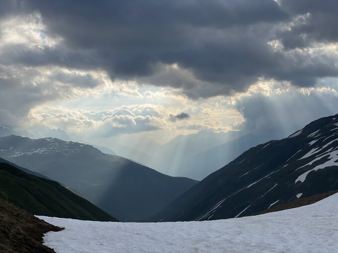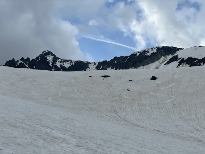 Wetter bewölkt, kurz leichter Regen, dann trocken. Kaum Sonne. Die Militärstrasse weist am Schluss noch ein kurzes Schneefeld auf, dort ist Abrutschverbot. Aufstieg im Nassschnee problemlos, mein Ziel war das Skidepot auf 2900 MüM, denn die steile Flanke überlasse ich halt jetzt den zweihändigen Menschen;-). Eigentlich wollte ich noch den Tälligrat anhängen, aber soo toll war das Wetter eben nicht und die Abfahrt auch nicht. Wie von Powderdream gestern beschrieben, war nur das kurze Stück auf dem kleinen Gletscher lohnend, der Rest ging, da die Regenkacheln aufgeweicht waren, recht ordeli. Eigentlich ein klares „machbar“, dachte ich schon während der Tour. Ich dachte auch, das sei definitiv die letzte Skitour der Saison, aber nun bin ich nicht mehr ganz sicher, und aus dem „ machbar“ wurde auf der Heimfahrt ein „gut“. Ist halt ein Gesamterlebnis und keine exakte Wissenschaft;-).