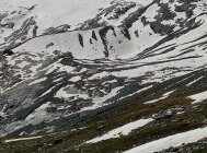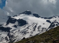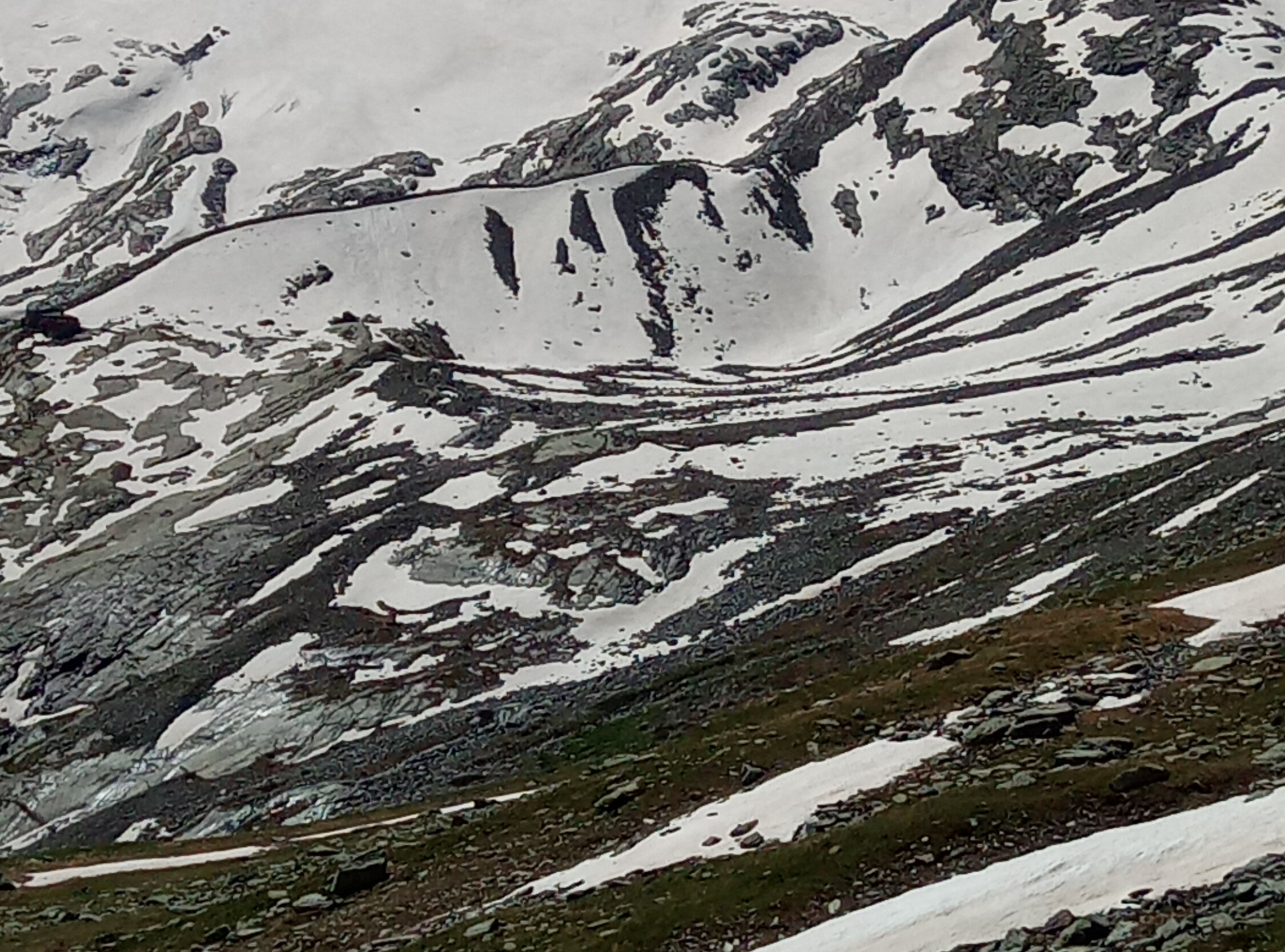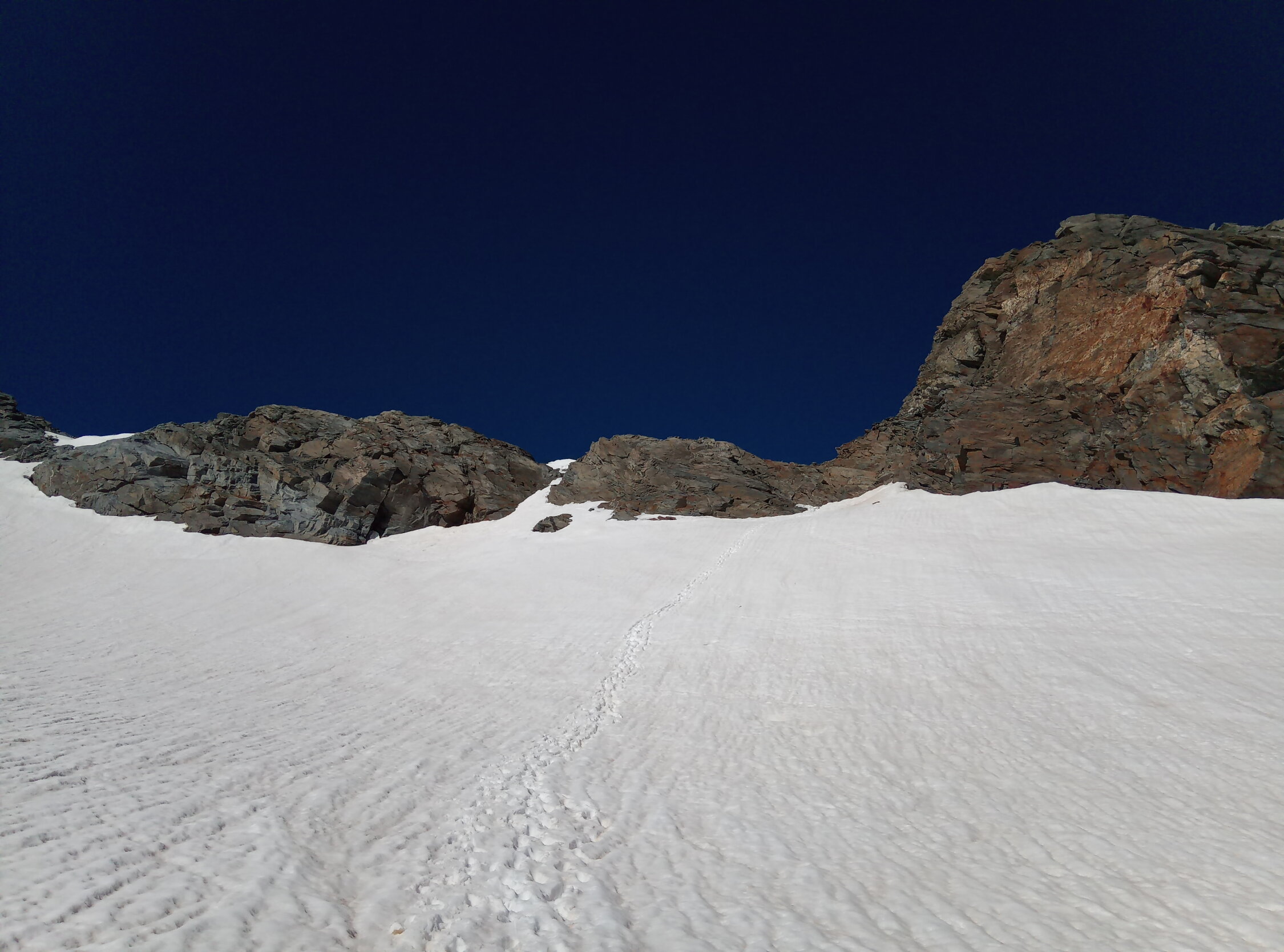 Noch hat es viele Schneefelder und bei nächtlicher Abstrahlung ist der Schnee tragend. Dies ermöglicht einen bequemen Aufgang ohne Rinnen, Felsbänder, Schutthänge und Blöcke. Auch das Felsband auf den Sattel ist kürzer! Für den Aufstieg des Gipfelaufbaus können die Steigeisen zurück gelassen werden; Man kann direkt auf dem Blockgrat Schnee frei hinauf (und runter) kraxeln.