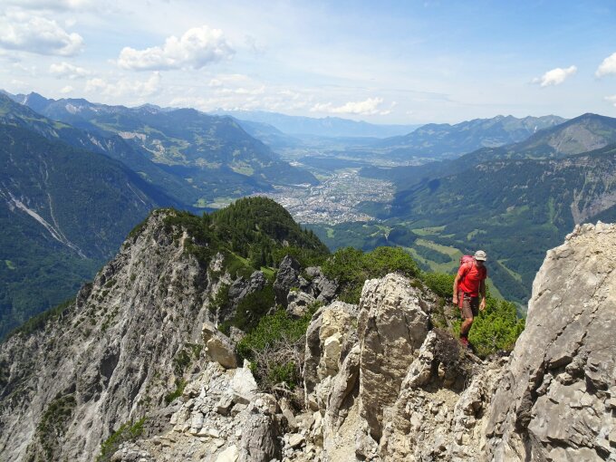 von Lorüns über Davennakopf Von Lorüns (ca. 600 m) auf markiertem, oben sehr steilem Steig zum Davennakopf (1.708 m). Kurz weiter auf dem kaum erkennbaren Pfad Richtung Außerbraz. Wo dieser deutlich nach Norden abbiegt in westlicher Richtung weiter. Querung mehrerer Wiesenhänge, immer unterhalb der Latschen- und Felszone bis nördlich unterhalb des Gipfels, wo eine steile erdige Rinne (akt. mit Seil versehen) fast unmittelbar zum Gipfel führt. Von hier weiter auf dem Höhenweg nach Westen mit Abstecher zum Zwölferkopf (1.843 m, Steig, teils felsig) und Spitzguf (1.908 m, wegloser Aufstieg von Nordosten über steile Grashänge). Dann Abstieg über die Valleukapelle (direkt ab der Scharte oder - deutlich länger - mit Gegenanstiegen über die Alplegi und Rellseck) zurück nach Lorüns. T5 nur die Rinne am Gipfel, sonst T3-T4.