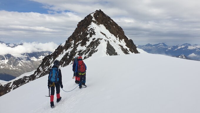Ca. 30 min ab Hütte Wandergelände. Dann konnten wir die Steigeisen anziehen. In der flanke ab Zwischenbergpass führt eine sehr gute Spur recht steil nach oben um dann links zum Grat zu ziehen. Der Firn war fest und so gingen wir zickzack, weil wir auch Kinder von 11 bis 12 Jahren dabei hatten. Südgrat dann im Fels trocken mit etwas Schnee, der nicht weiter stört. Vom Vorgipfel wieder guter Trittfirn bis zum Hauptgipfel. Abstieg mit Top Verhältnissen. Guter Trittfirn, tolle Spur, wenig offene Spalten. Sicherlich dank der vielen Schneefälle jetzt noch sehr gut machbar, aber sicherlich bald auch deutlich anspruchsvoller, vereist oder sogar nicht begehbar.