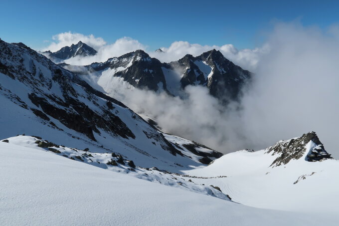 Start der Tour 05.45Uhr auf der Furkapasshöhe. Auf dem aperen Strässchen unter dem Blauberg und Griegufergrat durch in das Tal des Muttgletschers. Auf gefrorenen Schneekacheln (Sah aus wie ein Mini Gebirge) über den Gletscher unter das Gross Muttenhorn, dort Skidepot eingerichtet. Im Steilhang zum westlichen Gipfelgrat Trittschnee, stellenweise Bruchharsch. Am Grat entlang zum Gross Muttenhorn mussten einige Steinblöcke umgangen werden. Im Gipfelbereich lag ein Schäumchen Neuschnee. Die Fernsicht war trotz dem ständig herumvagabundierenden Nebel recht gut, die Temperaturen angenehm. Zurück zum Skidepot dort eine ganze Weile an der Sonne gesessen und auf das "aufsulzen" des Schnees gewartet. Um ca. 10 Uhr abgefahren,leider immer noch zu früh! Schüttel,schüttel,rüttel!