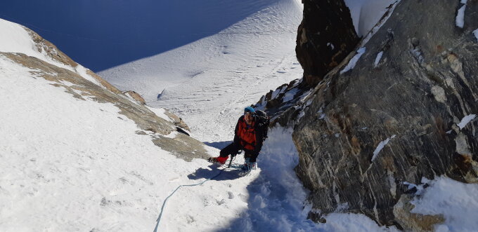 Gletscher sehr gut eingeschneit. Bruch am Anfang noch geschlossen und problemlos. Beginn des Westgrats etwas eisig, für sichere Geher aber ebenfalls friktionsfrei, sonst muss halt die eine oder andere Schraube gedreht werden. Fels trocken mit guter Spur dazwischen. Abstieg Silbersattel entlang neuer Eisenstifte (Abseilen) schnell und zackig. Elegante, schöne Spur vom Silbersattel talwärts. Eisschlaggefahr beachten.