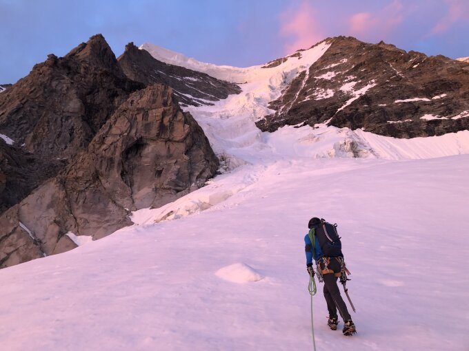 Abgesehen von der Sonne, die zumindest teilweise mangelware war, herrschen zur Zeit ideale Verhältnisse. Im gletscherzustieg noch viel Schnee, der Fels hingegen trocken. Am serac wiederum griffiges Eis.