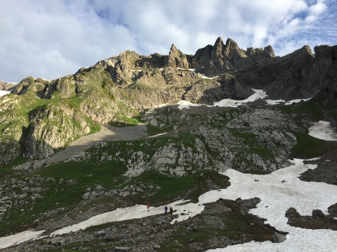 Aufstieg bis Ausstieg des markanten Turms inkl. Guppengrat zum Gipfel schneefrei. Umgehung des markanten Turms mit Grasschrofen/Fels teilweise unangenehm schmierig. Zustieg zur Chanzel und Rinne noch komplett eingeschneit und gut zu gehen. Bergschrund beginnt sich langsam zu öffnen. Der Abstieg über den Normalweg perfekte Verhältnisse. Gletscher noch komplett eingeschneit. Zeiten: Schwändi-Gipfel 4,5 Std, Gipfel-Hütte 1,25 Std, Hütte-Schwändi 1 Std.