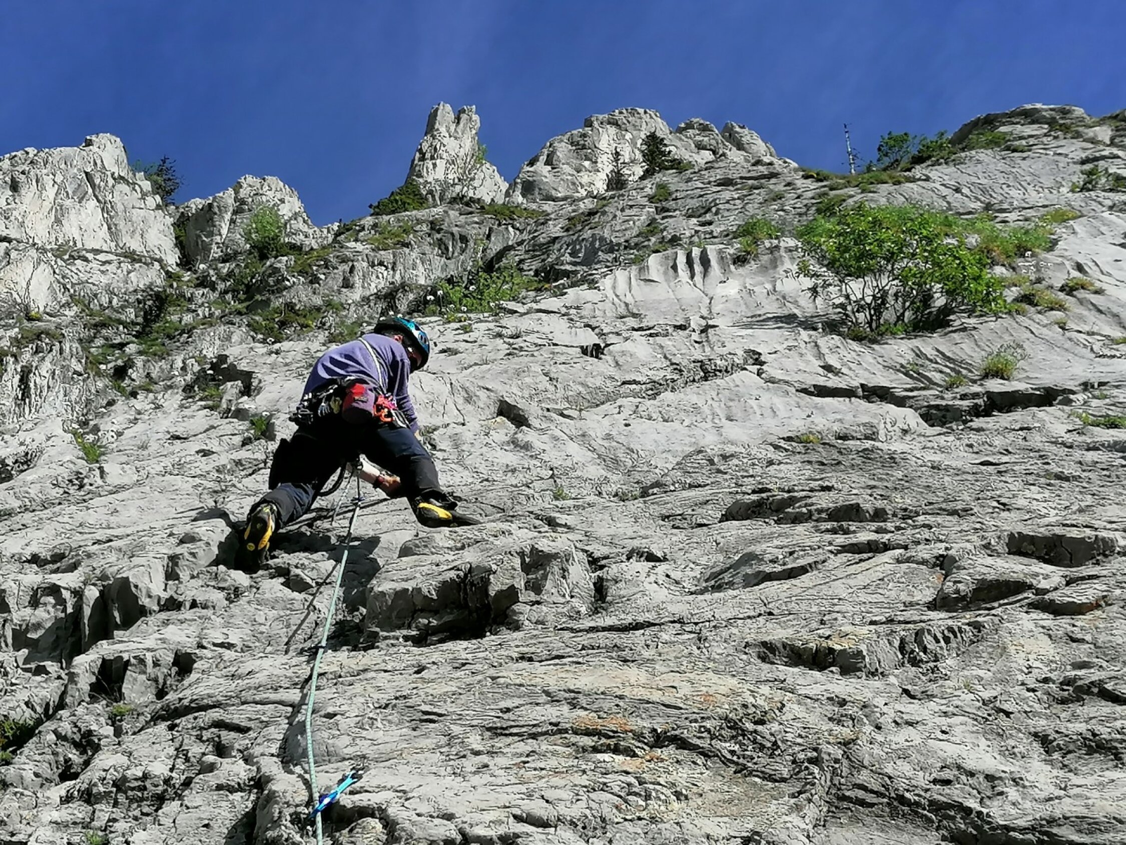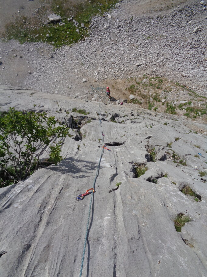 Klettern in der Südwand der Wandfluh, im Sektor Gravière. Hier hats schöne und gut abgesicherte Touren in bestem Wasserrillenkalk, die jedes Kletterherz höher schlagen lassen.