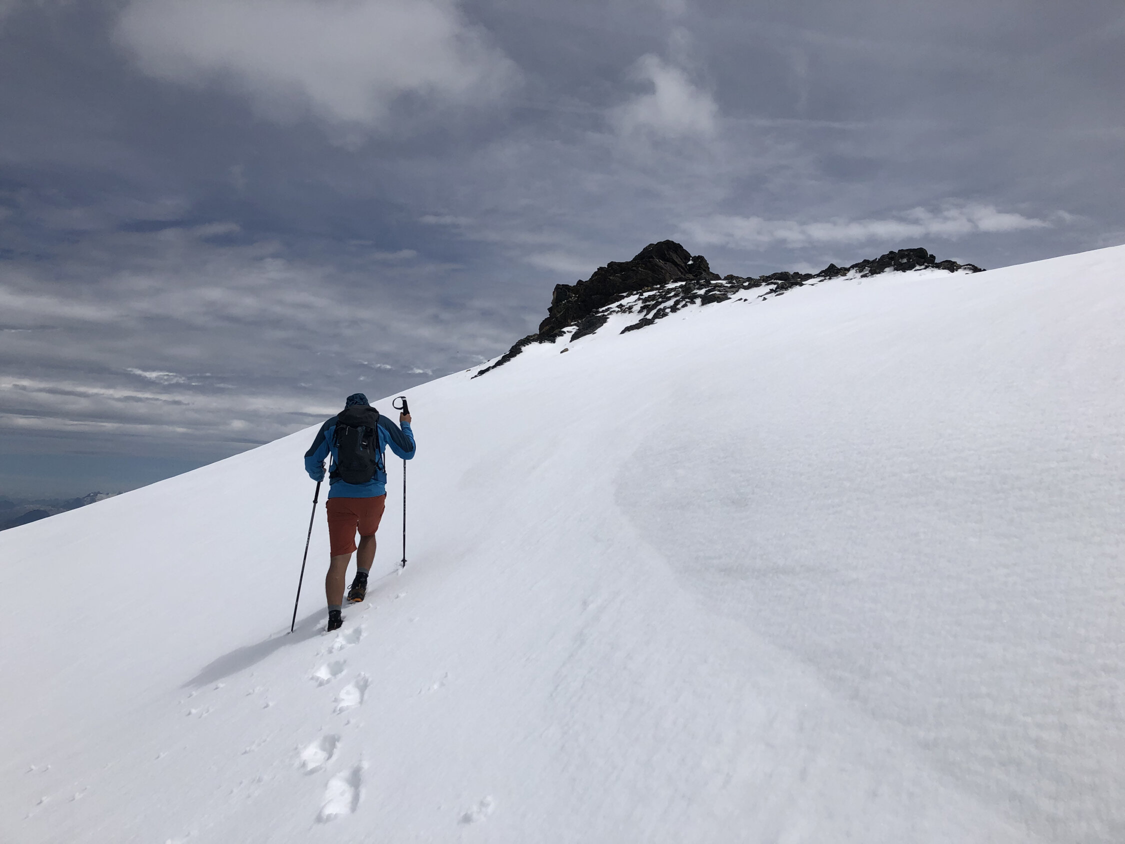 Alles bis zum Gletscher schneefrei und trocken. In 3:45 Stunden haben wir den Sendeturm erreicht und haben gehofft, den Gipfel in max. einer Stunde zu erobern. Bei den momentanen Bedingungen leider unmöglich. Es liegt zu viel Altschnee auf dem Grat und man sinkt oft bis zu den Hüften ein. Es gab auch keine Spur (kein Wunder...)