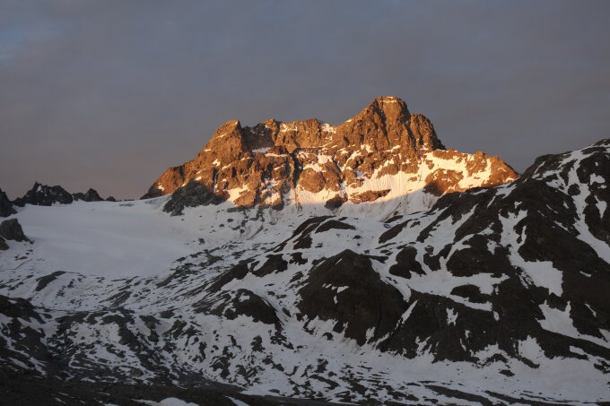 Start um 5:45 von der Keschhütte, Gletscher gefroren bei 5°C bei der Hütte und halbbedeckten Himmel, nach 1.5h am Einstieg, . Fels wunderbar trocken und angenehm zu Klettern, um 10:00 auf der Keschnadel. Eigentlich hätte man das ganze mit Bergschuhen gut machen können, 5 b Passage nass, umgangen, Gebraucht haben wir 3 Friends, 04/05/075, 6 Alpinexen, 2X 120Schlingen und 50m Seil, es hat wenig Borhaken, Stände gut sichtbar. Um 12:30 am Gipfel - tolle Sicht ins Berninagebiet und Bergell. zwischen Nadel und Hauptgipfel hat es eine kurze, tiefe Firnpassage, pickel reicht,Fels an den letzten 2 Türmen und Umgehungen brüchig. Wir hatten für den Abstieg Steigeisen dabei, aber nicht gebraucht, da Firn Passagen sehr tiefe Tritte haben. Um 2 beim "Einstieg der Normalroute, Firn immer noch Fest, max. Knöcheltiefes einsinken, um 15:00 bei der Hütte . Abstieg zum Parkplatz ca. 1h.