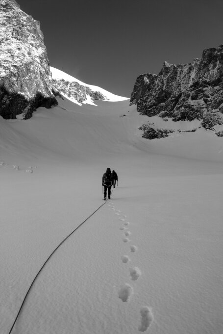 Windgepresster Neuschnee auf dem Chelengletscher. Gletscherspalten gut eingeschneit.