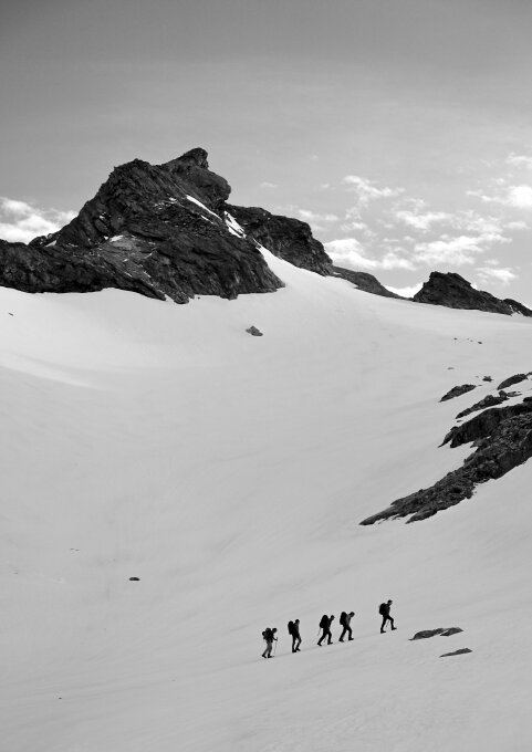 perfekte Firnverhältnisse, Bergschrund gut eingeschneit, Firn ohne Eis in der Südostflanke bis fast oben zum Ende des brüchigen Ostgrates, Achtung beim Ausstieg auf lose Steine, wenn andere Seilschaften in der Flanke hochsteigen.