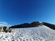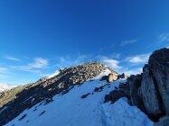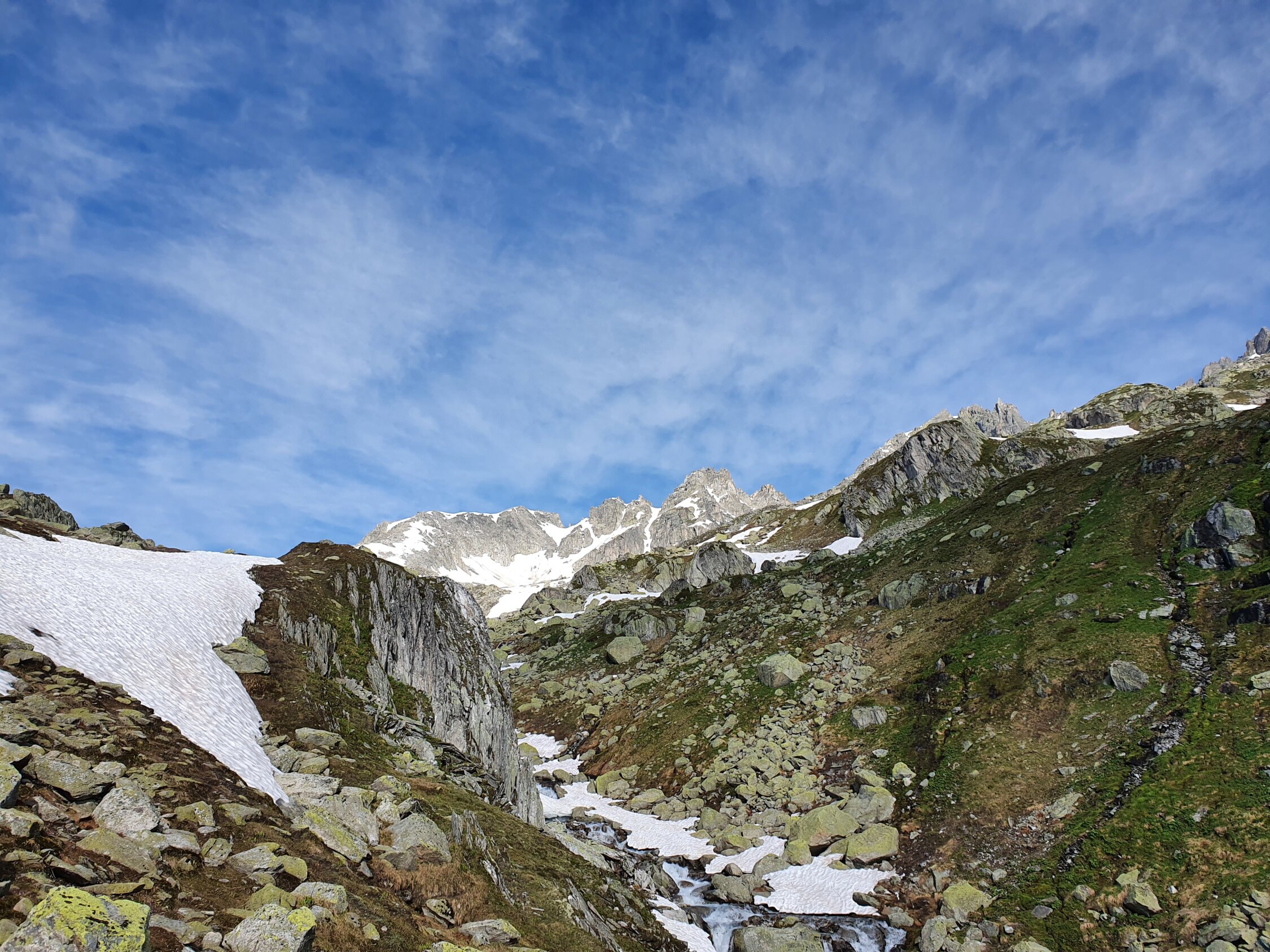 15 Minuten Ski tragen, dann das erste Schneefeld. Bis auf 2600 müM immer wieder Tragestrecken über Blockfelder. Dann bis 2900 müM durchgängige Schneedecke. Auf 2900 müM Skidepot gemacht, war der richtige Entscheid, Ski hochtragen hätte sich nicht gelohnt, da zu viel Block-Kraxeln und nur noch wenige Schneefelder. Abfahrt sehr ruppig über harten, tief zerfurchten Schnee, halt typische Juli-Verhältnisse.