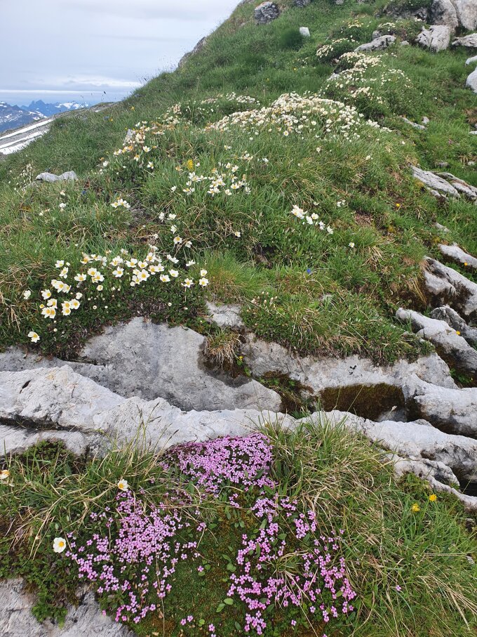 Kamin durch die Südostflanke geht sehr gut. Ist ausreichend markiert und an wenigen aber den nötigen Stellen mit Bohrhaken versehen. Abstieg über den Grat und durch das Band. Dort hat es im Moment noch 2 recht tückische Schneefelder, welche zumindest einen Pickel erfordern.