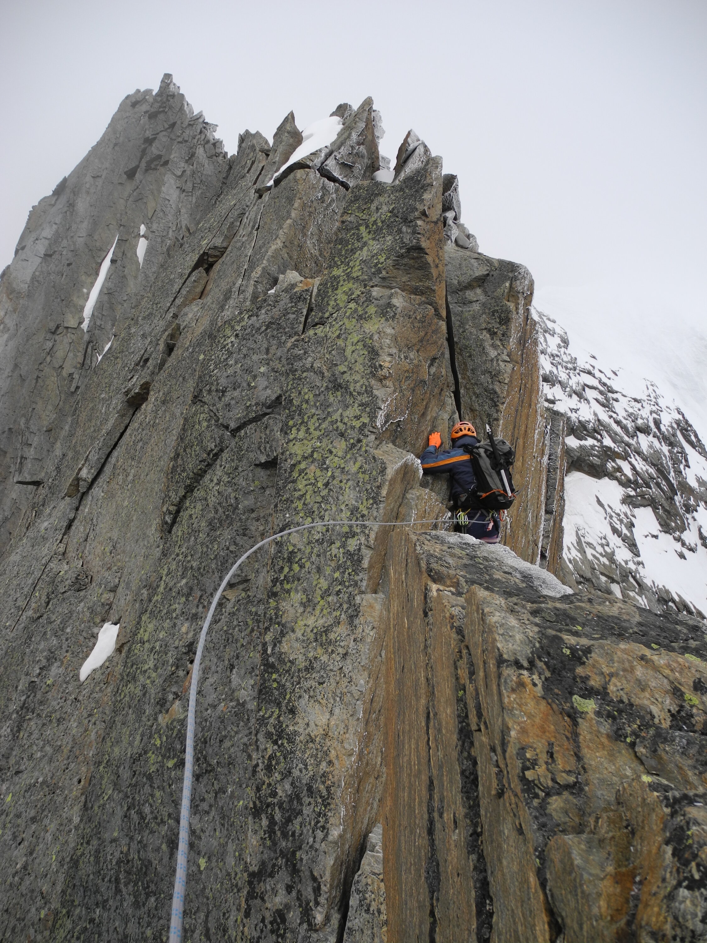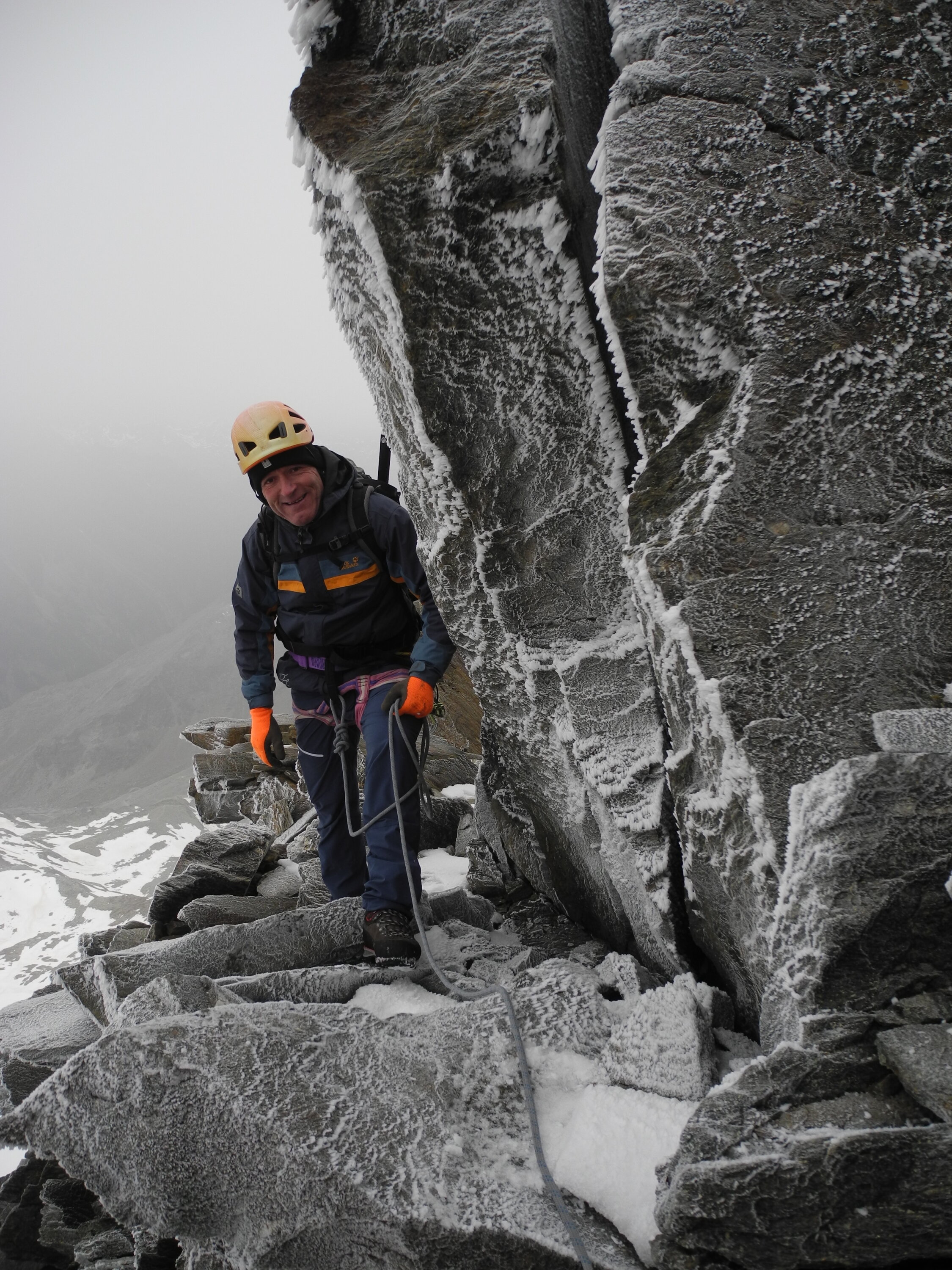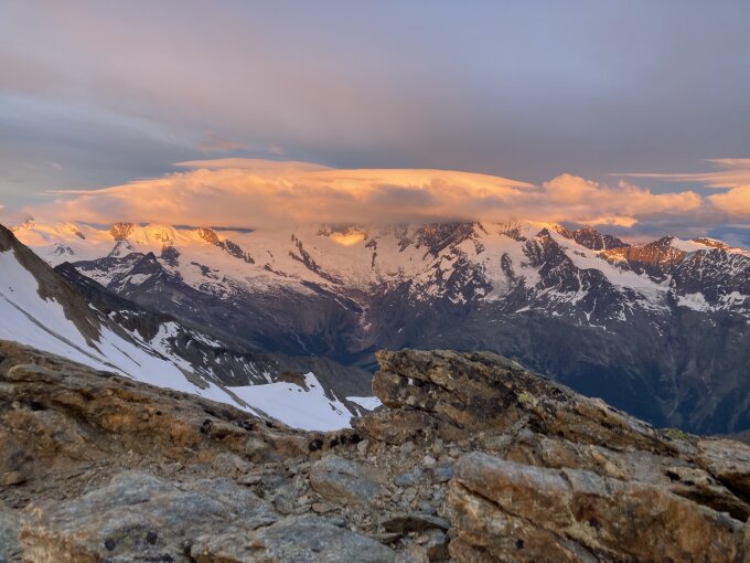 Der Zustieg zum Lagginjoch ist ausgezeichnet. Ohne Spalten. Der Grat ist bis Pkt 3828 schneefrei. Der letzte Teil im Firn ist ebenfalls bestens. Entgegen der Wetterprognosen sorgten Wolken und starker Westwind für zusätzliche Action.