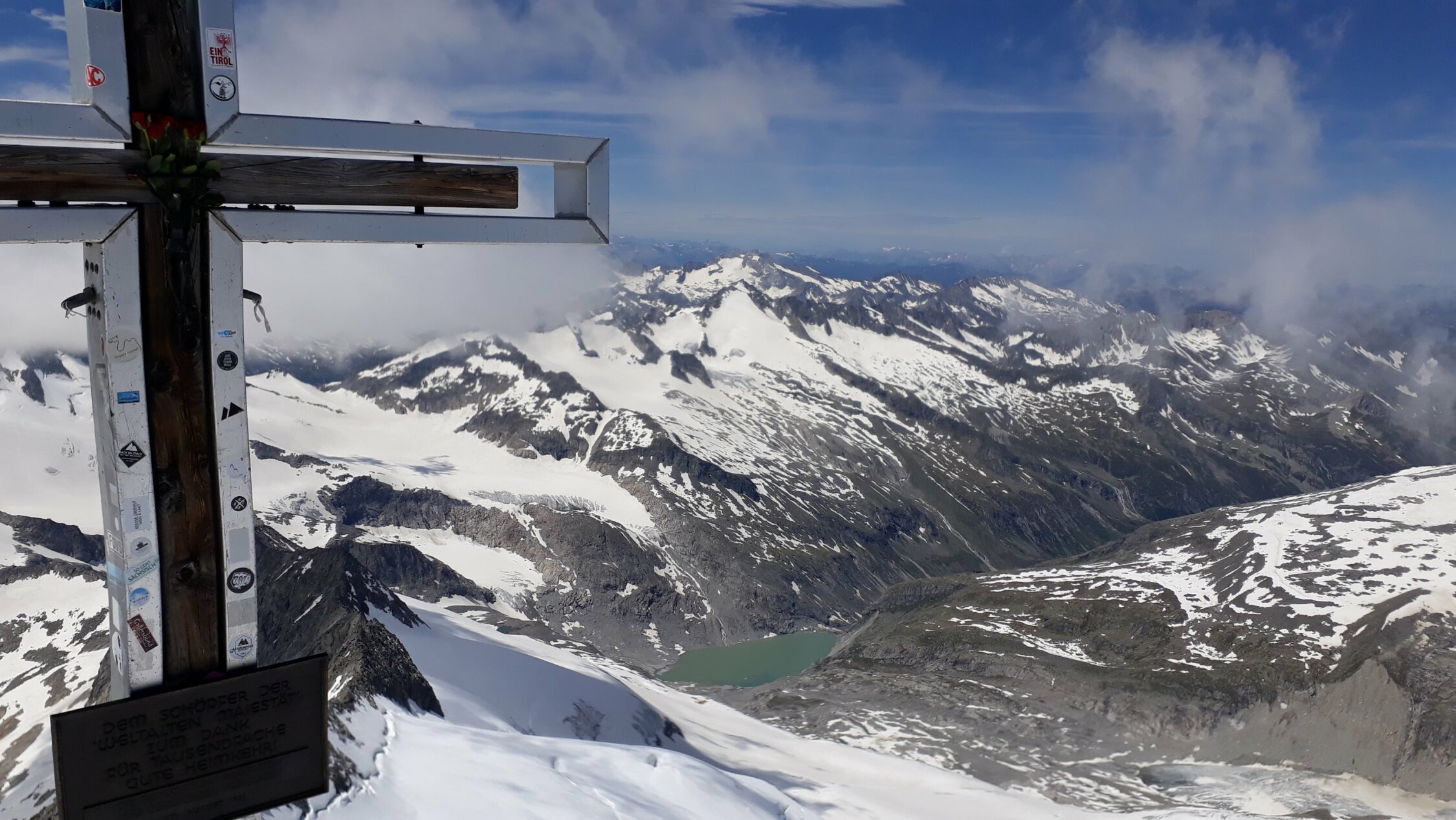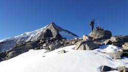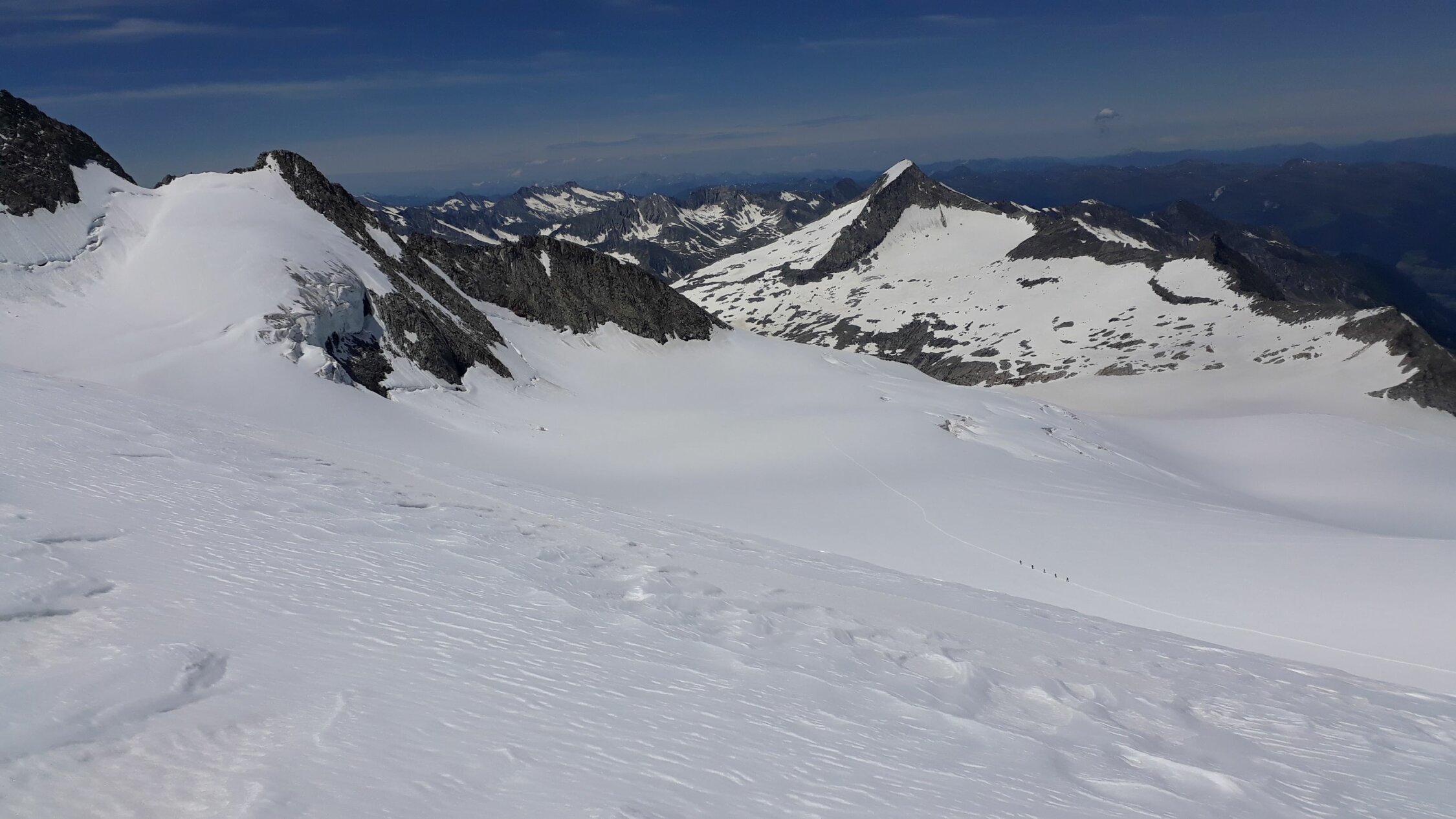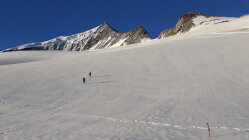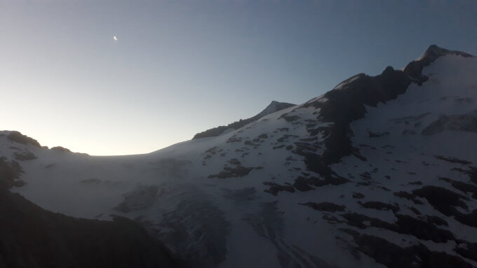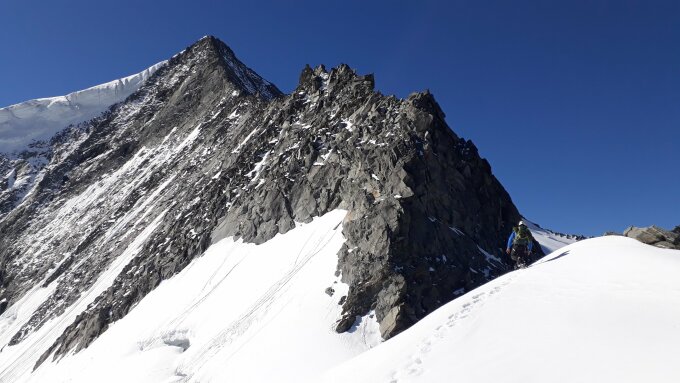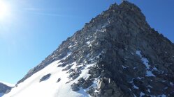 um 4.15h an der Kürsinger Hütte (2547m) gestartet. Der Gletscher beginnt bei ca. 2700m. Zunächst guter Trittfirn, der dann aber noch im Zustieg zum Punkt 3295m (3273 auf AV Karte) in weicheren Schnee wechselt. Wir waren zusammen mit einer zweiten Seilschaft die Ersten nach dem Schlechtwetter mit Schneefall von vor zwei Tagen, so dass wir mühsam spuren mußten. Bei einer Holzstange in 3295 geginnt die Kletterei, nach einer waagrechten Passage kommt ein erster Abstieg, der etwas mühsam in eine Blockrinne nach links vorne abgeseilt werden kann (nicht senkrecht nach links abseilen!). Der Fels war am kompletten Grat trocken und schneefrei, so dass wir bis zum letzten, steileren Abschnitt der langen Route seilfrei geklettert sind. Ab hier dann mit regulärer Seilsicherung. In der schwierigen Seillänge gibt es Bohrhaken und alte Schlaghaken. Wie man genau klettert, muss man vor Ort entscheiden. Das Topo war hier nicht sehr erhellend. Zum Schluß gab es dann liegengebliebenen Schnee zwischen den Felsen, der aber nicht weiter störte. Einziger Minuspunkt der Tour war in den letzten Seillängen der kalte Westwind. Der Abstieg auf dem Normalweg führt dann an verschiedenen Stellen über große Querspalten, so dass man auf jeden Fall angeseilt gehen sollte. 4.15 Start, 7.15 Markierungsstange, 11.30 Gipfel, 14.30 Hütte