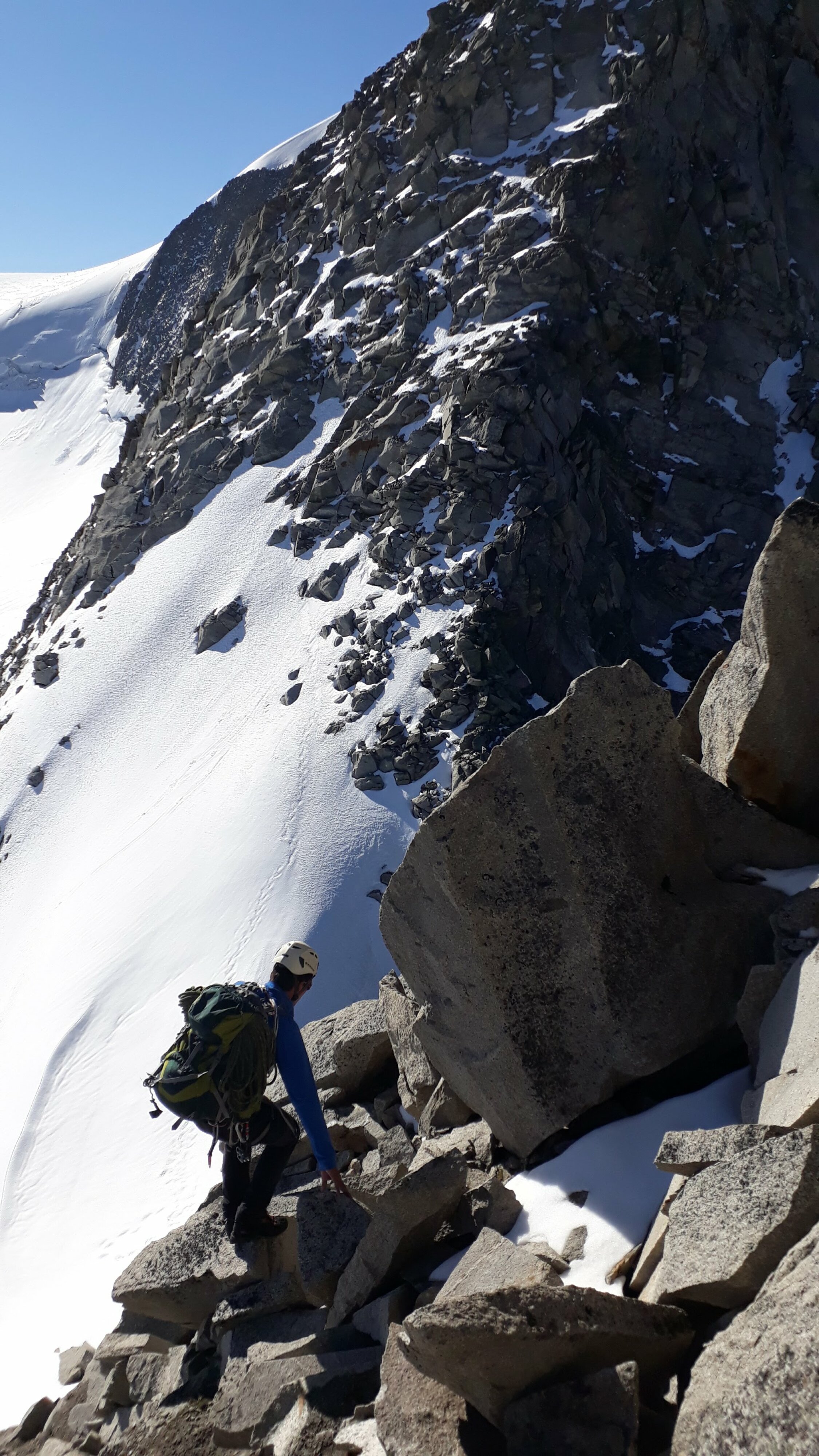 Superschöne, lange und größtenteils einfache Klettertour über große Blöcke und Rippen, teilweise herrlich ausgesetzt, aber wegen des Gletscherzu- und Abstiegs mit schwerem Rucksack. Die schwierigsten Seillängen kommen zum Schluss und können bei schlechteren Bedingungen anstrengend werden, deswegen Reserven mitbringen! Bedingungen sind gerade ideal.