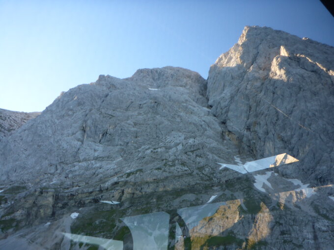 ein einziges Schneefeld in der oberen Rinne (siehe Bild) gesehen bei der Hochfahrt zur Zugspitze von der Gondel aus(auf den Weg zum Jubigrat)