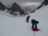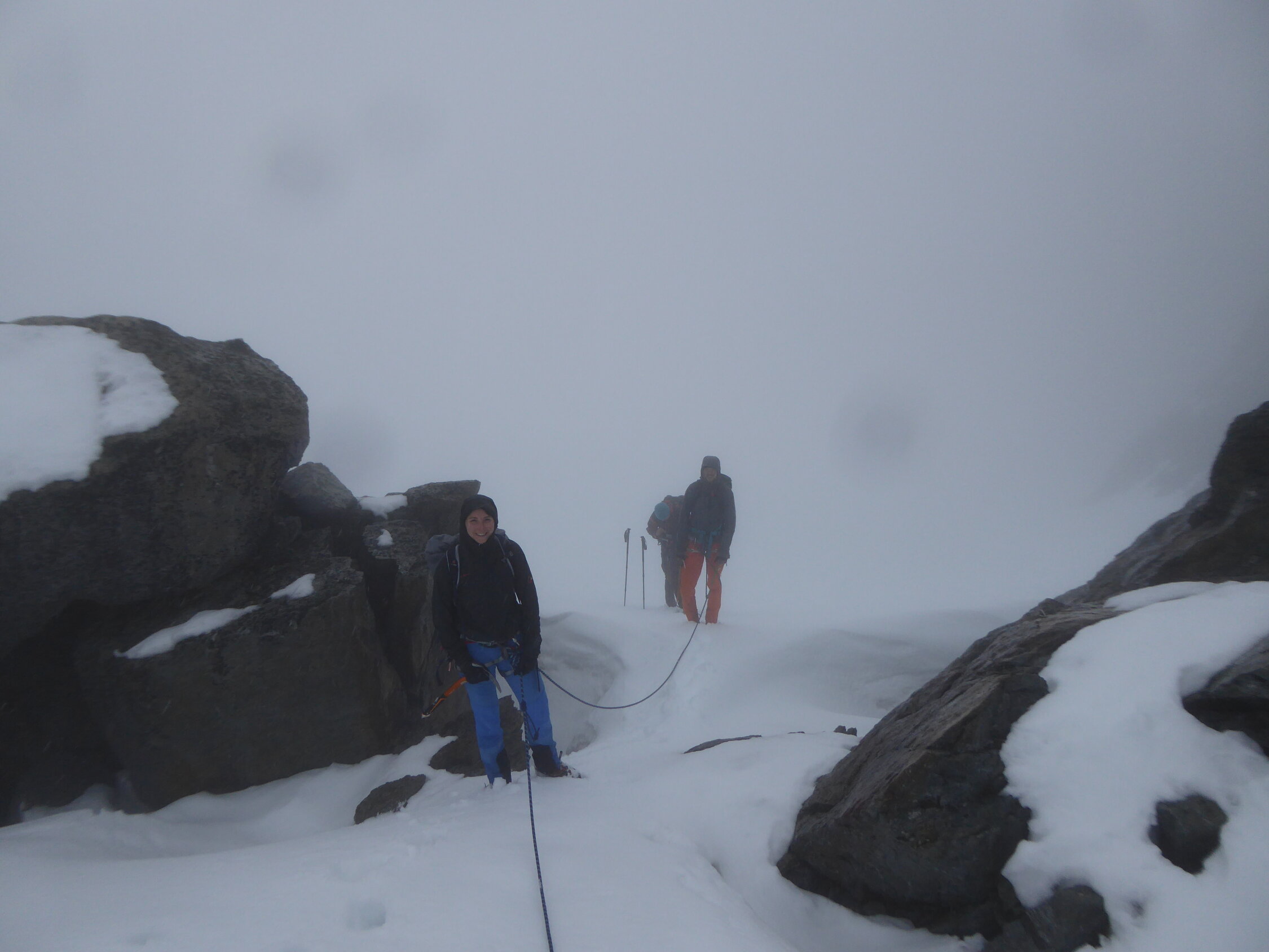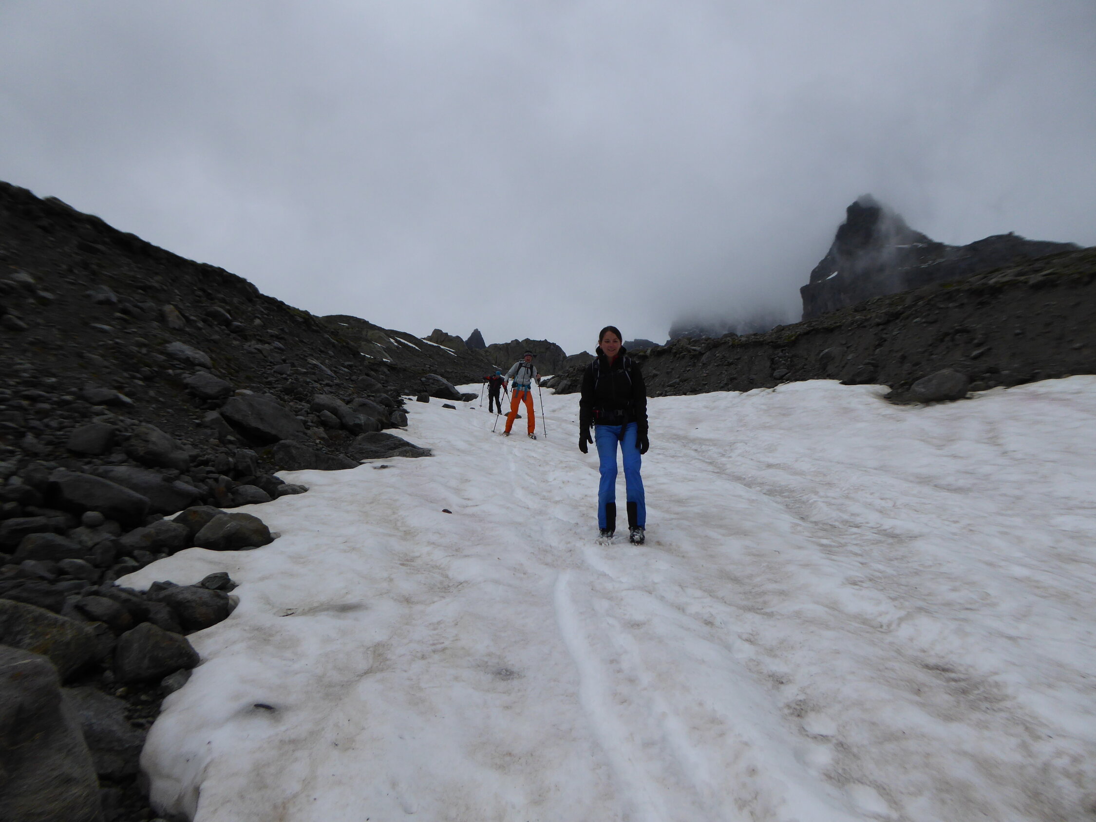 Ab Steingletscher gestartet. Aufstieg auf durchgehendem Schneefeld ab ca. 2300m, was den Aufstieg und dann auch den Abstieg wesentlich vereinfacht hat. Trotzdem mussten wir teilweise Schienbein tief Spurarbeit leisten. Gletscher noch komplett eingeschneit. Heute Null Sicht und Nieselregen, teils Regen. Alleine am Berg!