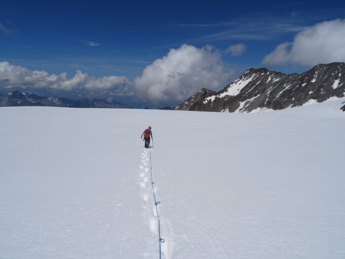 Über steile Blankeisstelle auf Frontalzacken wadenfordernd vom Windjoch runter zum Riedgletscher und dann zunächst sumpfig, später über tragende Spur zum Ende und weiter zur Bordierhütte. Dehydriert dort zunächst eine Pause eingelegt und noch mal 2:40h runter bis ins Tal. In Summe knapp 16 Stunden auf den Beinen. Eindrucksvolle Tour. Sehr gut akklimatisiert gewesen, sonst wäre das nicht gegangen (am Vortag wurde eine Seilschaft Höhenkrank ausgeflogen). An sich super Verhältnisse. Dürrenhorn allerdings ein gefährlicher Bruchhaufen, der mich sicher nie wieder sehen wird. Am Ende des Tages platt und zufrieden.