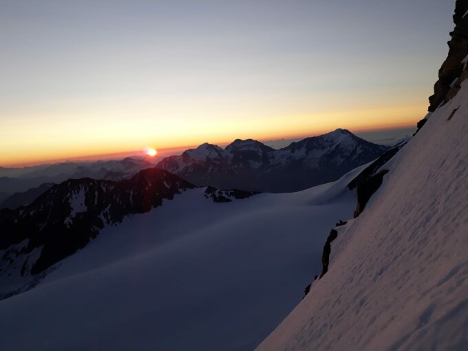 Wecker um 1:50 Uhr, Frühstück um 2. Start zusammen mit 3 anderen Seilschaften über den tragfähig gefrorenen Riedgletscher bis zur Selle. Durch das 55 Grad steile Firncolouir (kam uns aber weniger steil vor) bei besten Verhältnissen (gefroren, kein Steinschlag) rauf auf den Grat. (Oben nur noch ca 30-40cm Firn im Ausstieg, apert bald aus. Dann mental fordernd durch unangenehm übles Bruchgelände zunächst seilfrei zum Dürrenhorn (4.034m). Abstieg zunächst ebenfalls durch gefährlichen Bruch aber zum Dürrenjoch hin besser werdend. Ab dann über festen Firn und besseren Fels am gestreckten Seil zum Hohberghorn (4.219m). Abstieg ins Hohbergjoch. Hälfte geschafft. Steiler und zackiger Grataufstieg (Fels teils recht blätterteigartig aber gut zu klettern) zum Stecknadelhorn (4.241m). Von dort erneut Abstieg. Am Nadelhorn für die Querung im Firn (45 Grad) entschieden und weiter zum 4. Gipfel und 4.000er des Tages, zum Nadelhorn (4.327m).