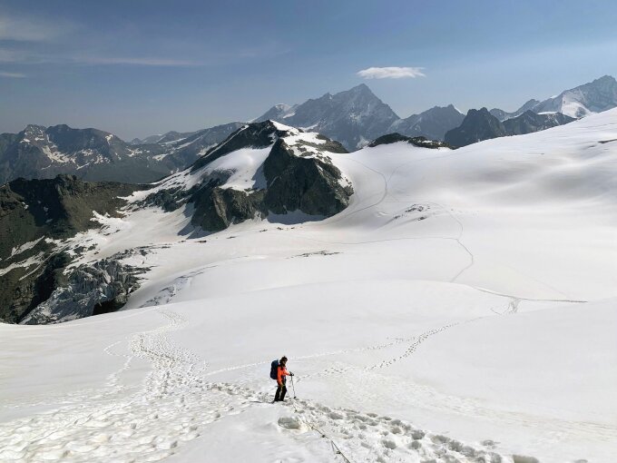 Wetter perfekt. Warm, sonnig und trotz leichtem Dunst gute Fernsicht. Hütte gut besucht, am Berg jedoch rel. ruhig. Beide Berge sind geniale Aussichtspunkte auf die umgebende Viertausenderprominenz.