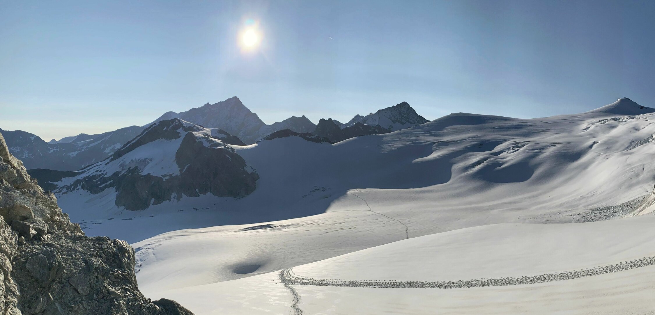 Gletscher noch gut eingeschneit, morgens gefroren. Felsgrate trocken und weitgehend schneefrei. Gute Spur am Firngrat zur Pointe de Mourti. Gletscherquerung hinüber zur Pigne am späten Vormittag weich, aber noch nicht sulzig. Abstieg vom Col du Pigne teilweise markiert und gut zu finden.