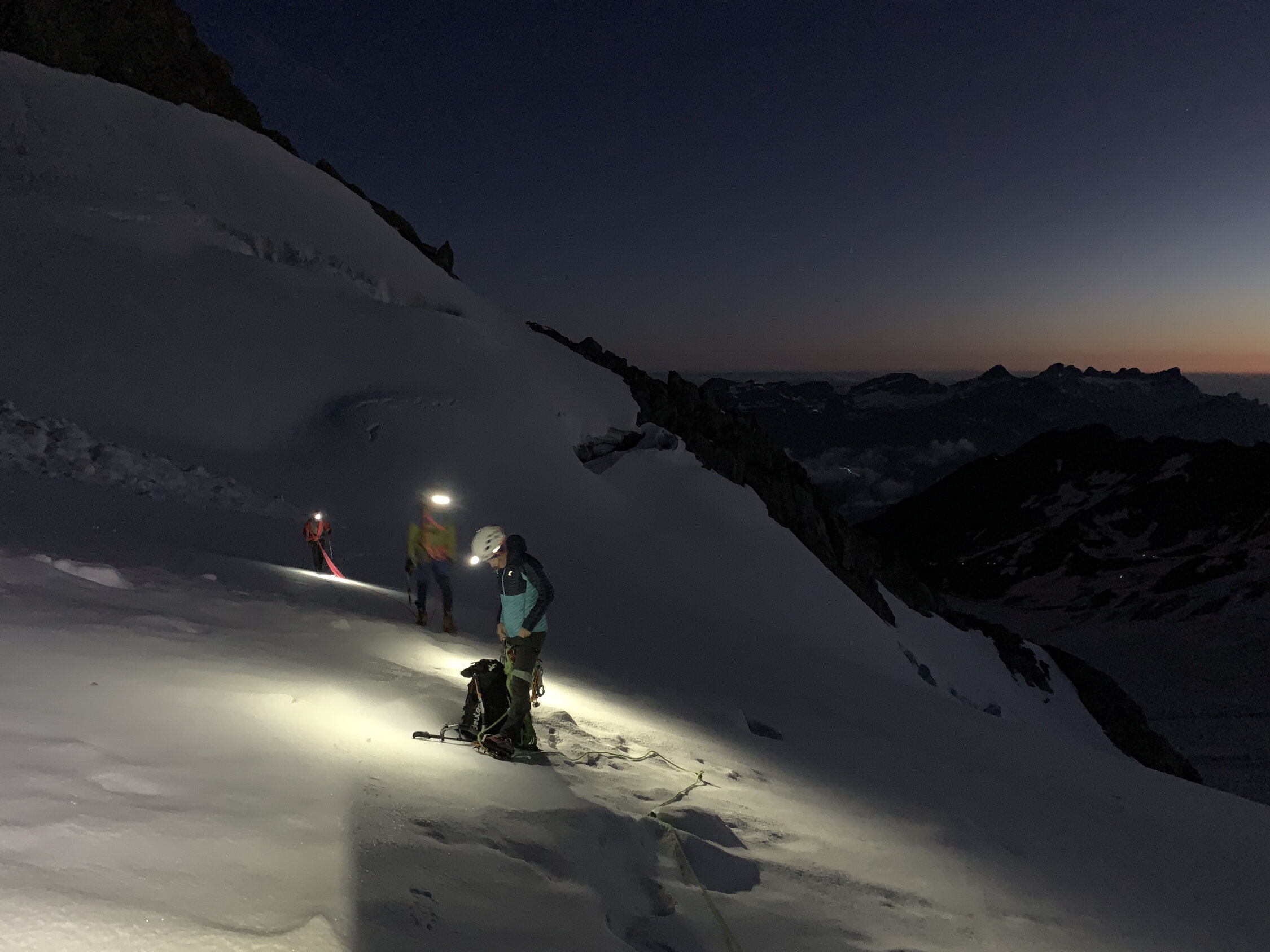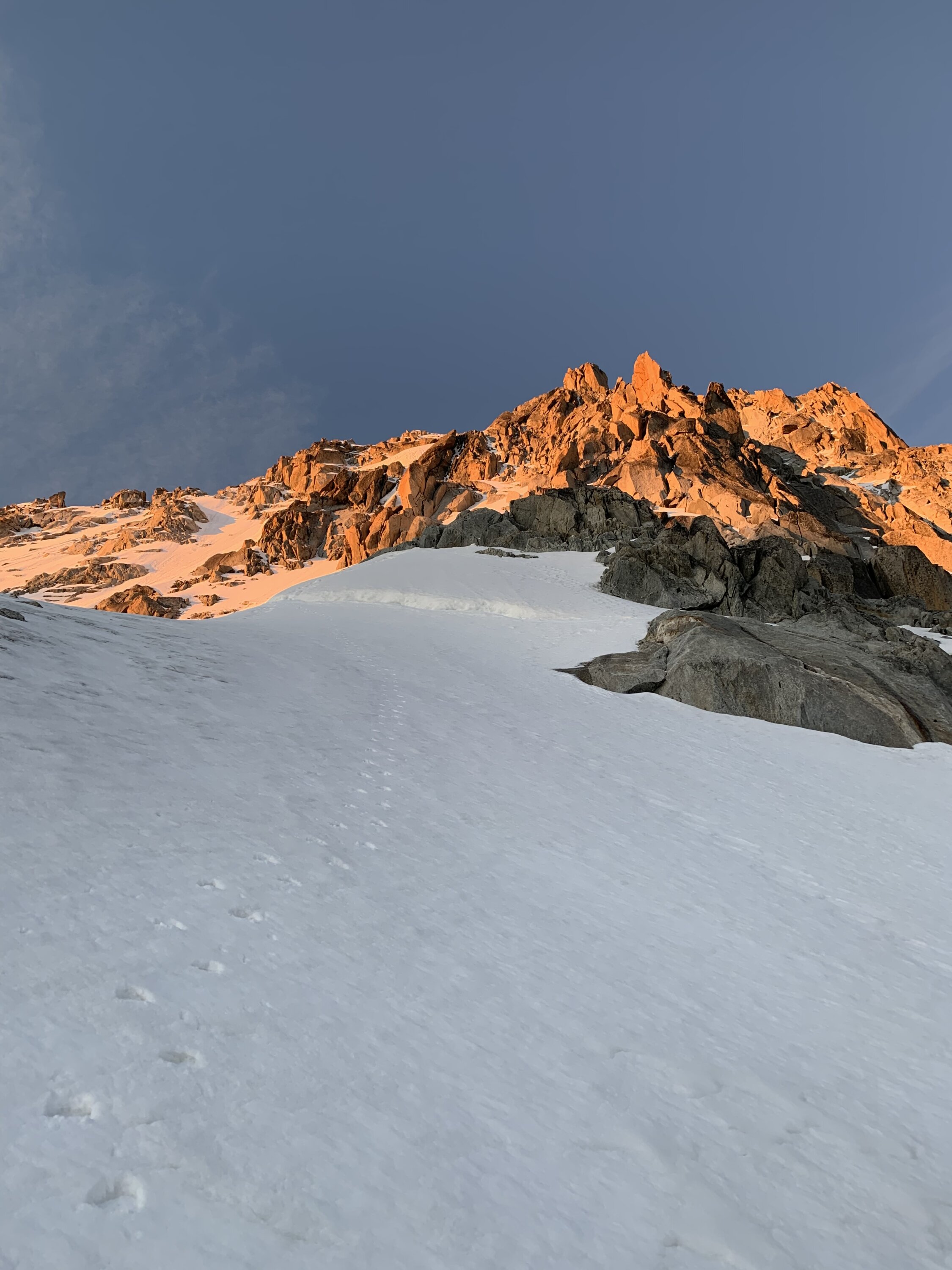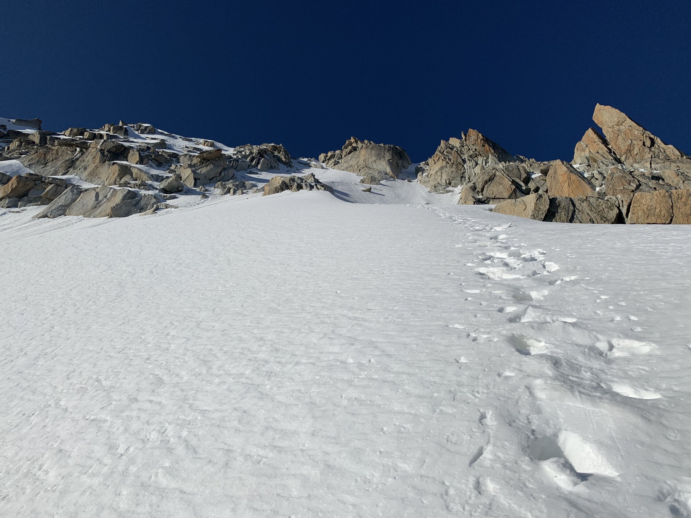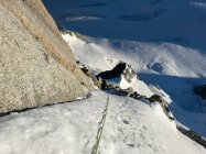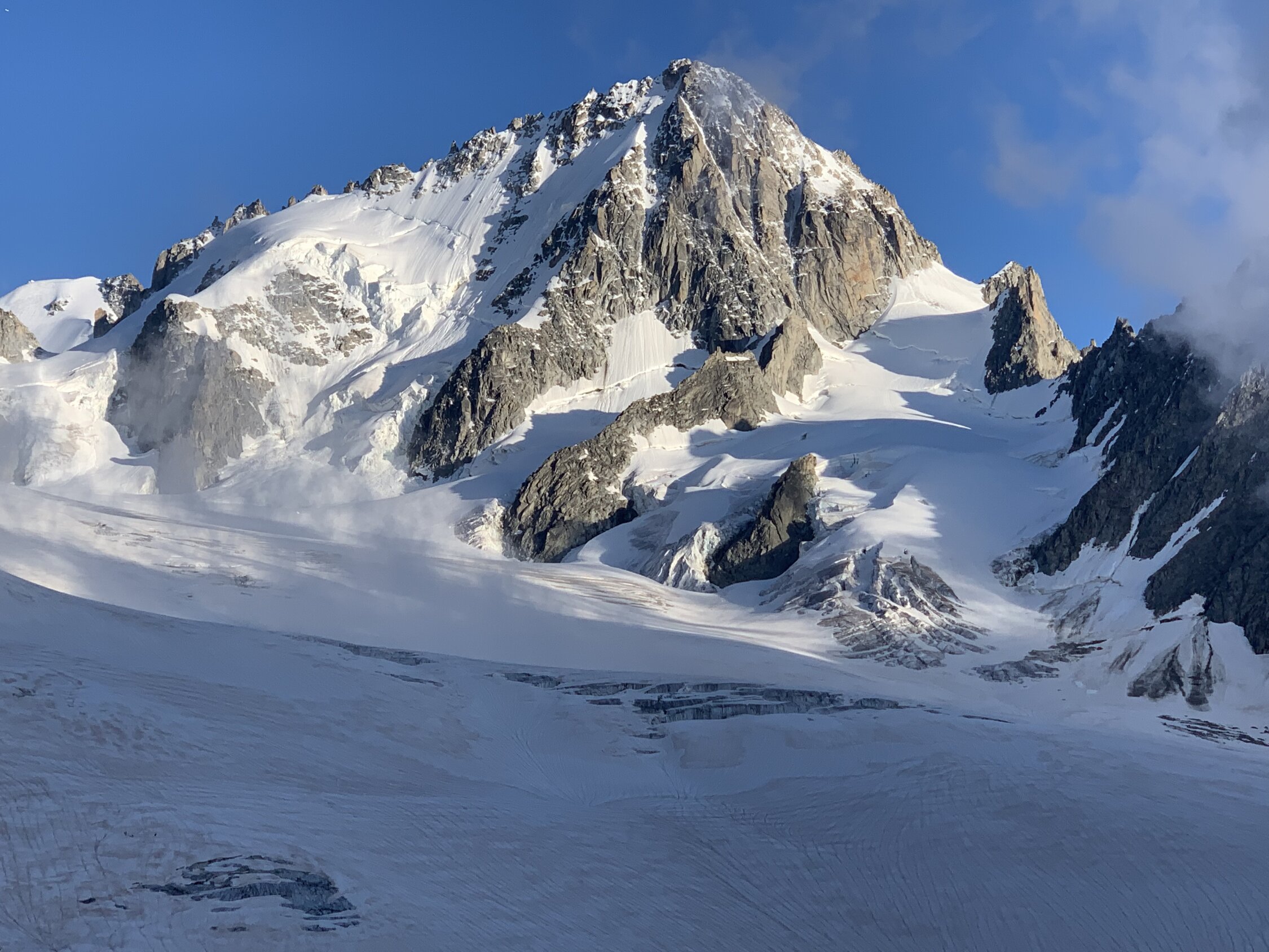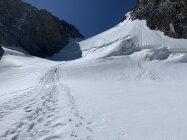 Start 2:45 Refuge Albert 1er. Gletscher nach sternklarer Nacht tragend gefroren. Regenrinnen vom Gewitter am frühen Morgen des Vortags bis gegen 3100 m. Alte Spur im Zustieg zum Pfeilerfuss ab ca. 3200 m erkennbar, ab dann durchgehend bis zum Gipfel. Randspalte auf schmalen Band noch gut passierbar. Guter Trittfirn, z.Zt. bereits schon dünn, insbesondere auf der markanten Firnrippe unterhalb des Gipfels. Abstieg über Normalroute oben Firn, nach Abseilpiste (2 x 50 m) ist der oberste Firnhang fast blank (40 Grad). Bergschrund gut überwindbar. Glacier du Tour im Abstieg gegen Mittag noch meist tragend.
