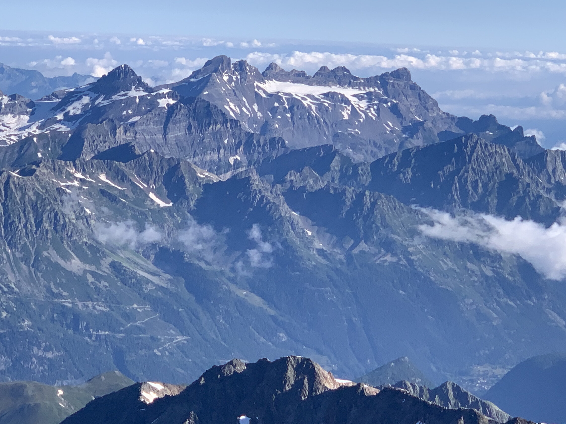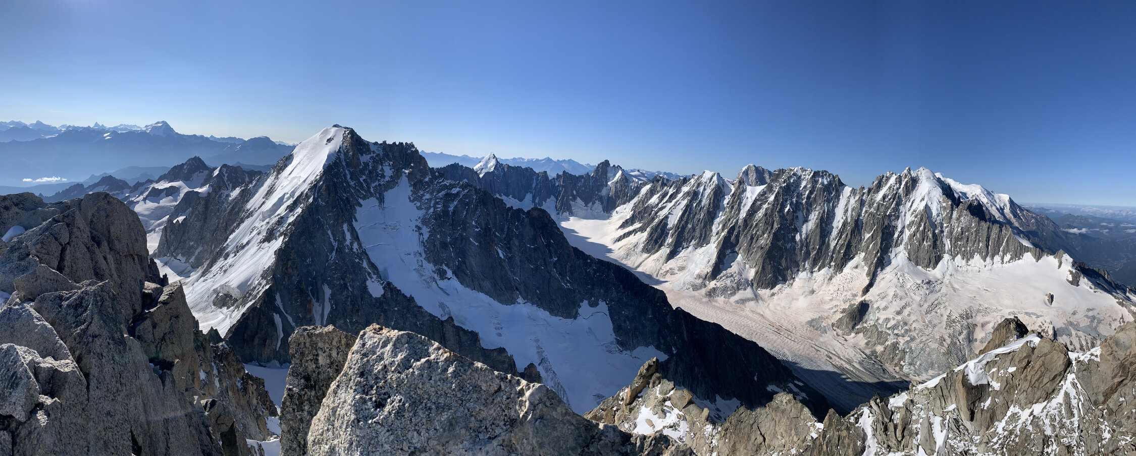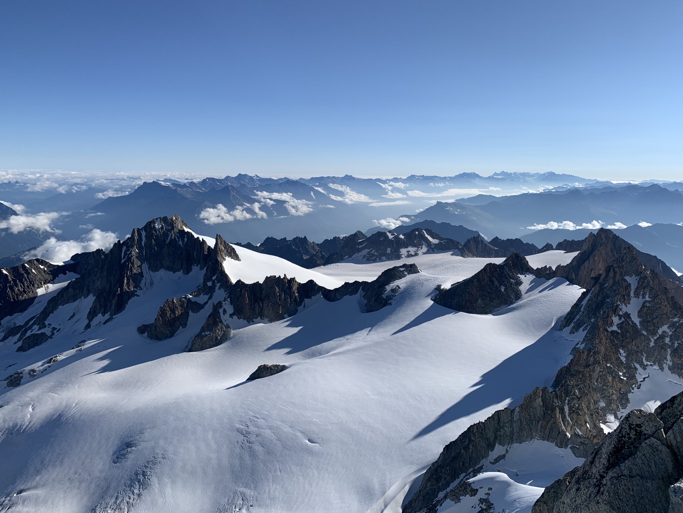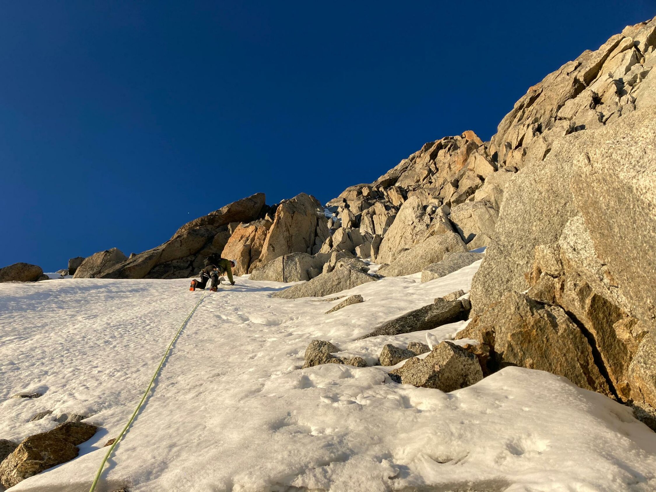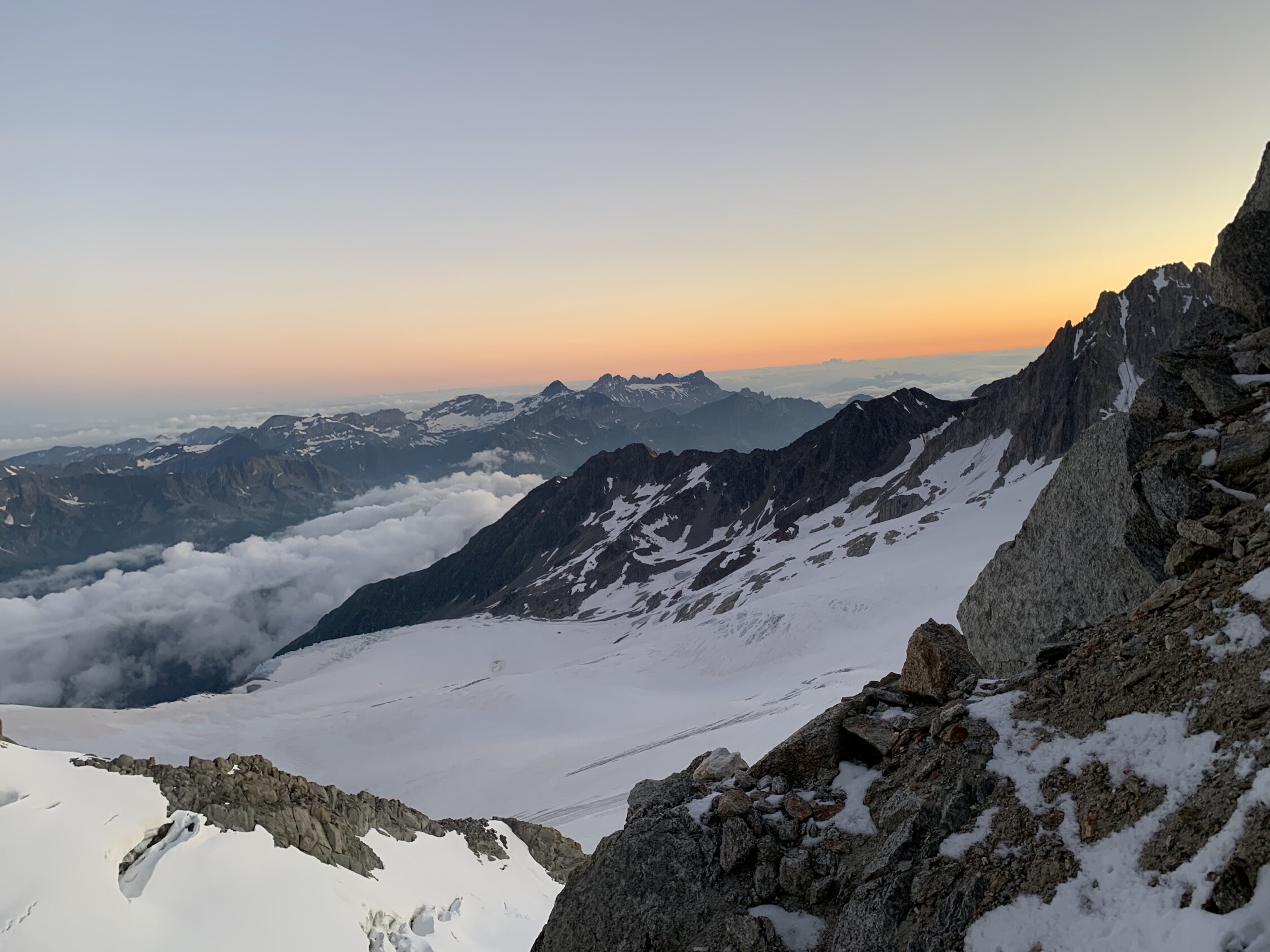 Start 2:45 Refuge Albert 1er. Gletscher nach sternklarer Nacht tragend gefroren. Regenrinnen vom Gewitter am frühen Morgen des Vortags bis gegen 3100 m. Alte Spur im Zustieg zum Pfeilerfuss ab ca. 3200 m erkennbar, ab dann durchgehend bis zum Gipfel. Randspalte auf schmalen Band noch gut passierbar. Guter Trittfirn, z.Zt. bereits schon dünn, insbesondere auf der markanten Firnrippe unterhalb des Gipfels. Abstieg über Normalroute oben Firn, nach Abseilpiste (2 x 50 m) ist der oberste Firnhang fast blank (40 Grad). Bergschrund gut überwindbar. Glacier du Tour im Abstieg gegen Mittag noch meist tragend.