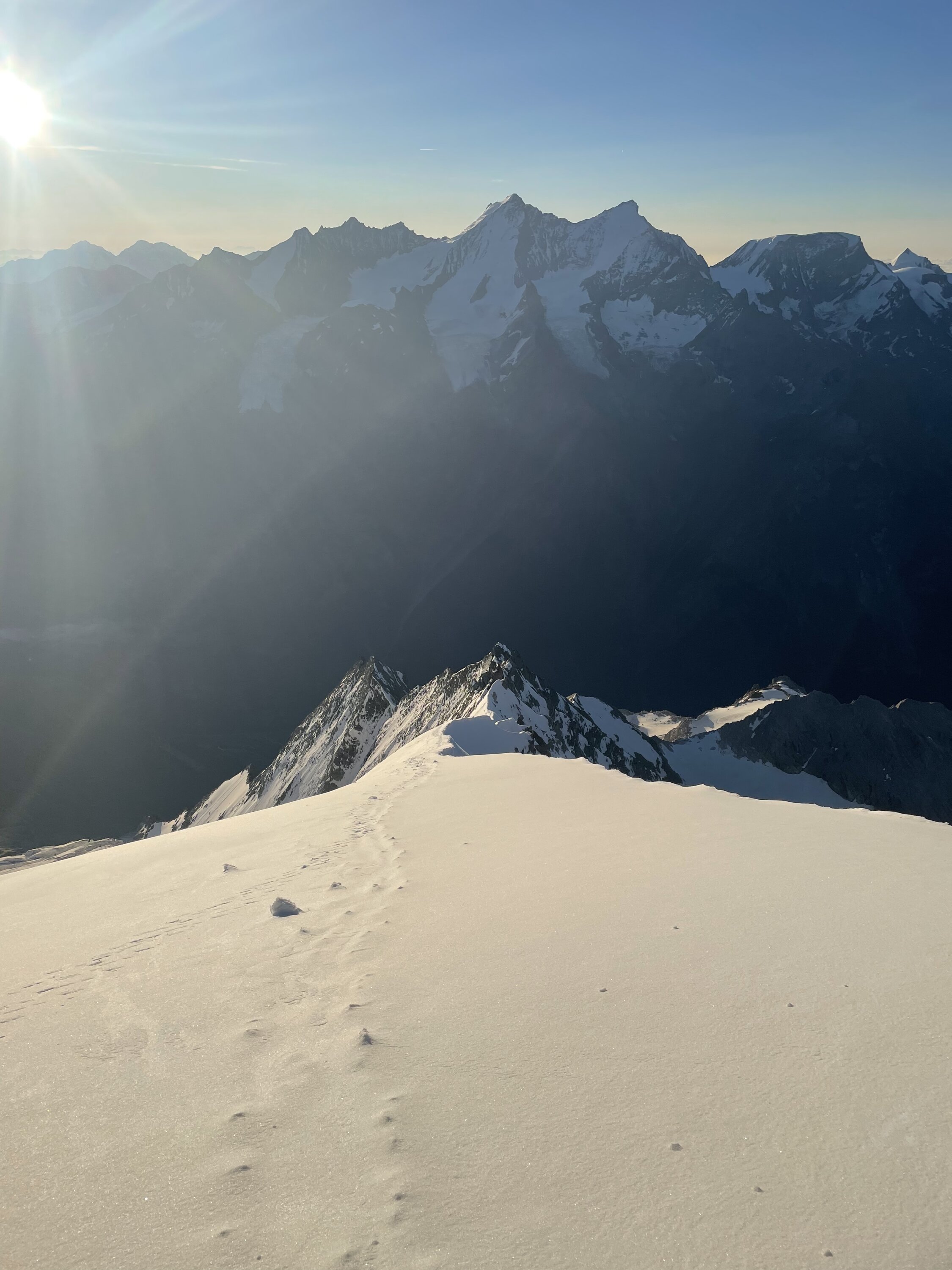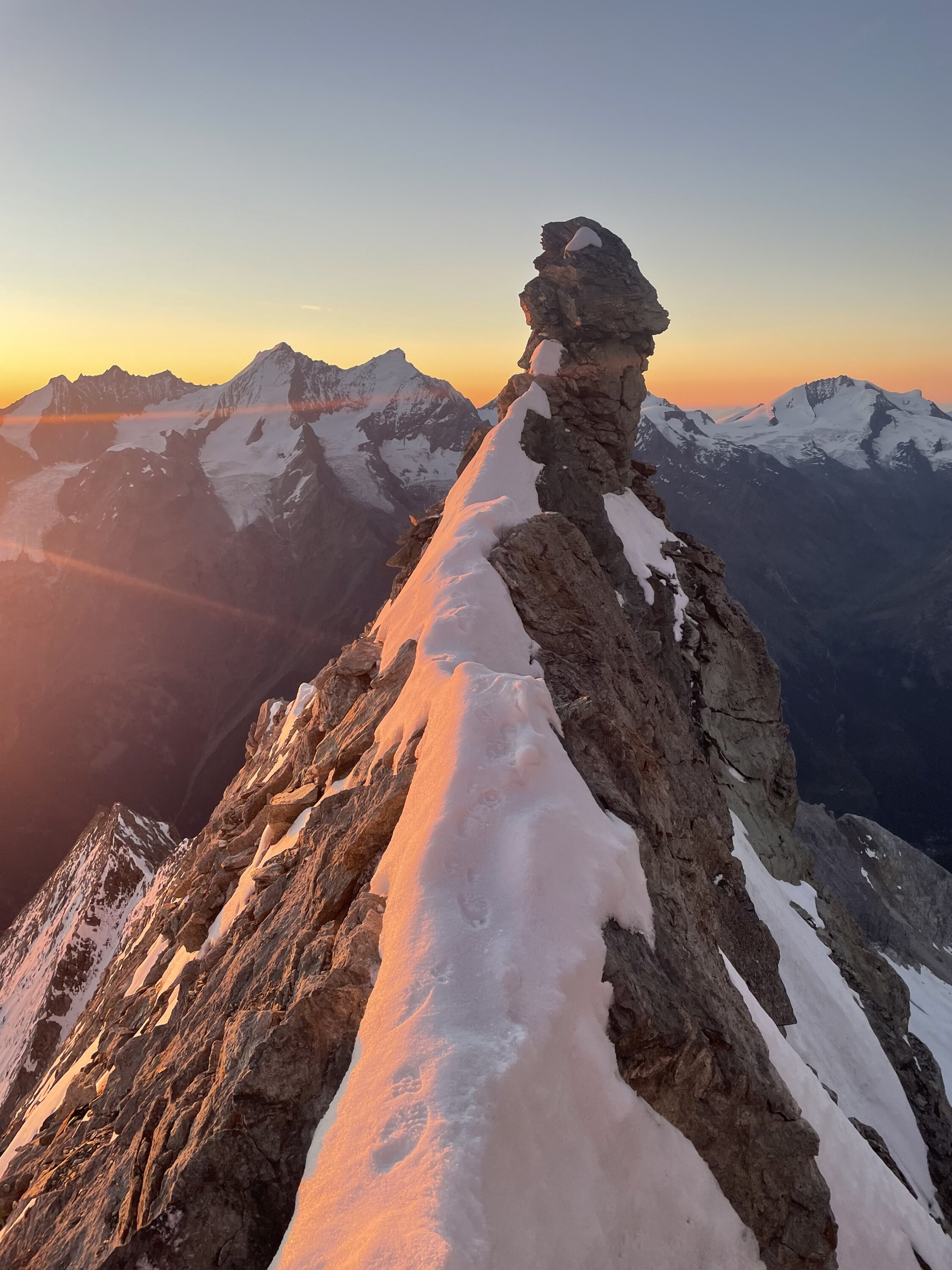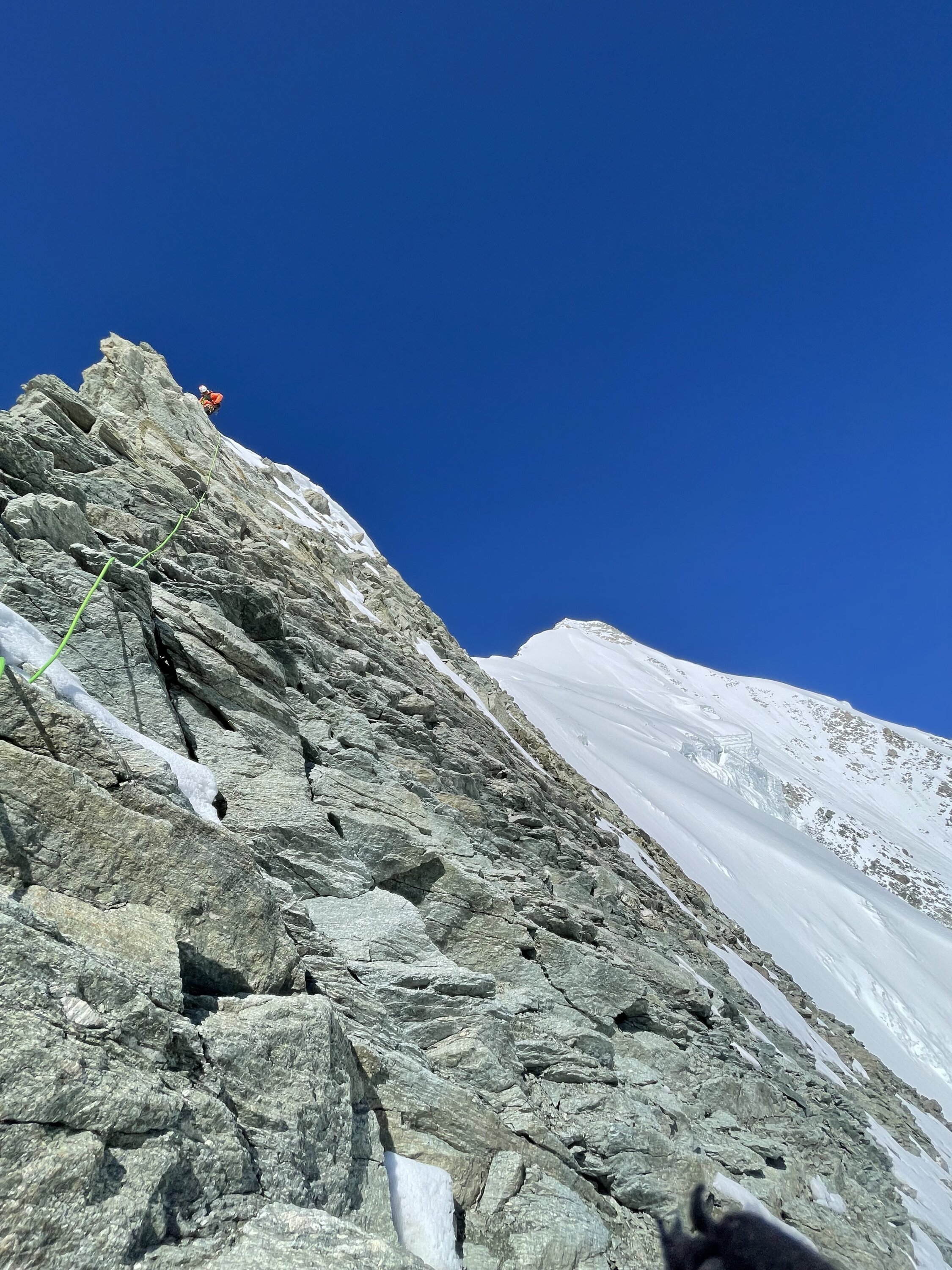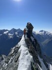 Gut bezieht sich’s if den Grat der mehrheitlich trocken war. Dennoch ist flinkes seilhandling unabdingbar. Der Übergang zum firn ist schmal und es bedarf sicherem gehen auf Steigeisen. Bis zum Gipfel Aufbau teils tritt Schnee aber auch etwas Neuschnee der nicht verfirnt ist. Alte Spuren wenig hilfreich. Gipfel Aufbau winterlich, bis zu 30 cm Schnee auf den Felsen verlangen zum Ende nochmals Einsatz. Beim Abstieg sollte man früh dran sein, wir waren um 8 am Gipfel, recht viel später wurde ich aktuell vermeiden. Der Schnee wird schnell faul und die Marge ist dünn an diesem Berg.