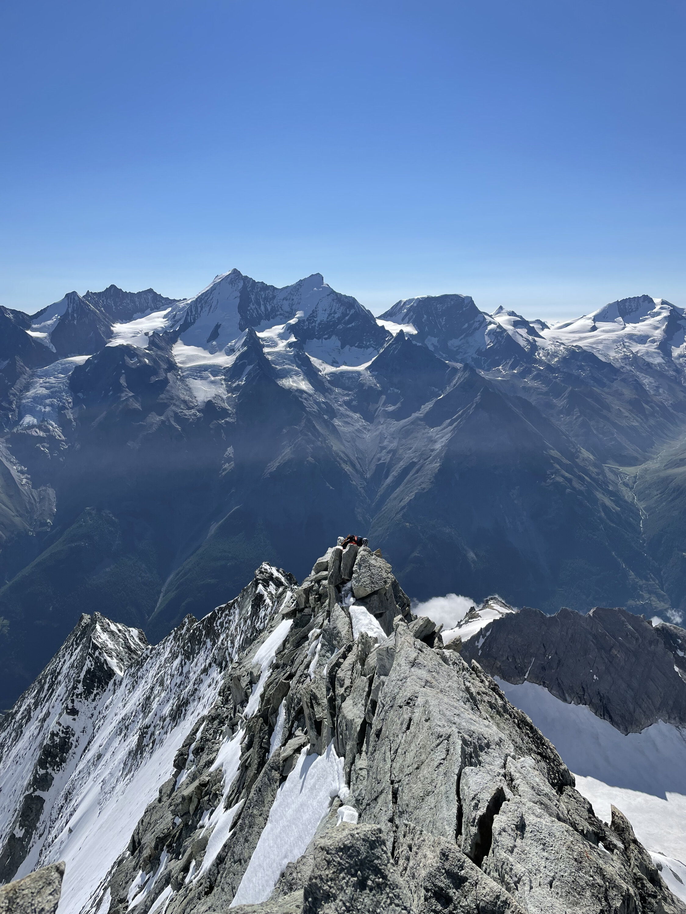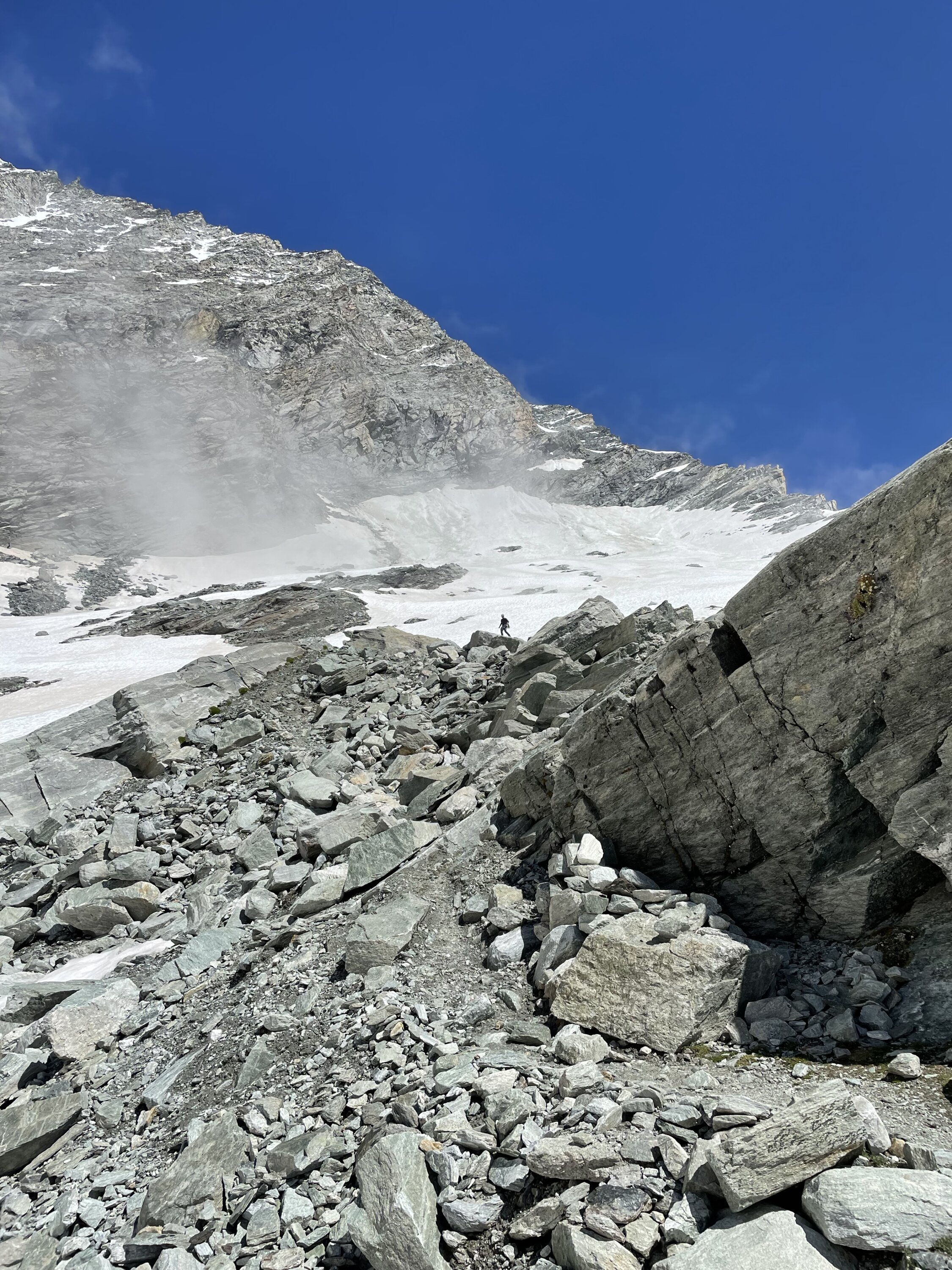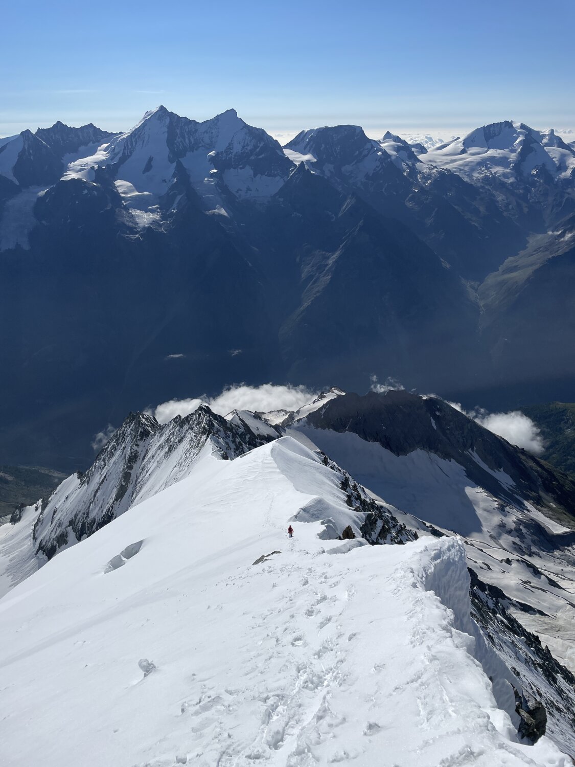 Gut bezieht sich’s if den Grat der mehrheitlich trocken war. Dennoch ist flinkes seilhandling unabdingbar. Der Übergang zum firn ist schmal und es bedarf sicherem gehen auf Steigeisen. Bis zum Gipfel Aufbau teils tritt Schnee aber auch etwas Neuschnee der nicht verfirnt ist. Alte Spuren wenig hilfreich. Gipfel Aufbau winterlich, bis zu 30 cm Schnee auf den Felsen verlangen zum Ende nochmals Einsatz. Beim Abstieg sollte man früh dran sein, wir waren um 8 am Gipfel, recht viel später wurde ich aktuell vermeiden. Der Schnee wird schnell faul und die Marge ist dünn an diesem Berg.