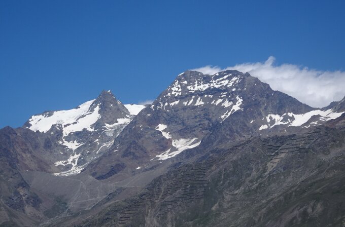 Das Lagginhorn war 2013 mein erster 4000er - viele sind in der Zwischenzeit nicht dazugekommen... Heute habe ich den Gipfel als Skyrun im Rahmen meiner Wanderferien in der Region wiederholt. Wobei, gerannt im engeren Sinne bin ich nicht, bloss zügig gegangen. Und natürlich mit leichter Ausrüstung, v.a. das Schuhwerk betreffend. 2:30 ab Kreuzboden bis zum Gipfel, knapp 1:30 runter nach Hohsaas. Neben einem halben Dutzend klassischen Seilschaften und einem Alleingänger mit Hund traf ich auf dem Gipfel einen spanischen Gleichgesinnten wieder, der schon mit mir in der Gondel sass . Wir sind dann bis Ende Gletscher gemeinsam abgestiegen.