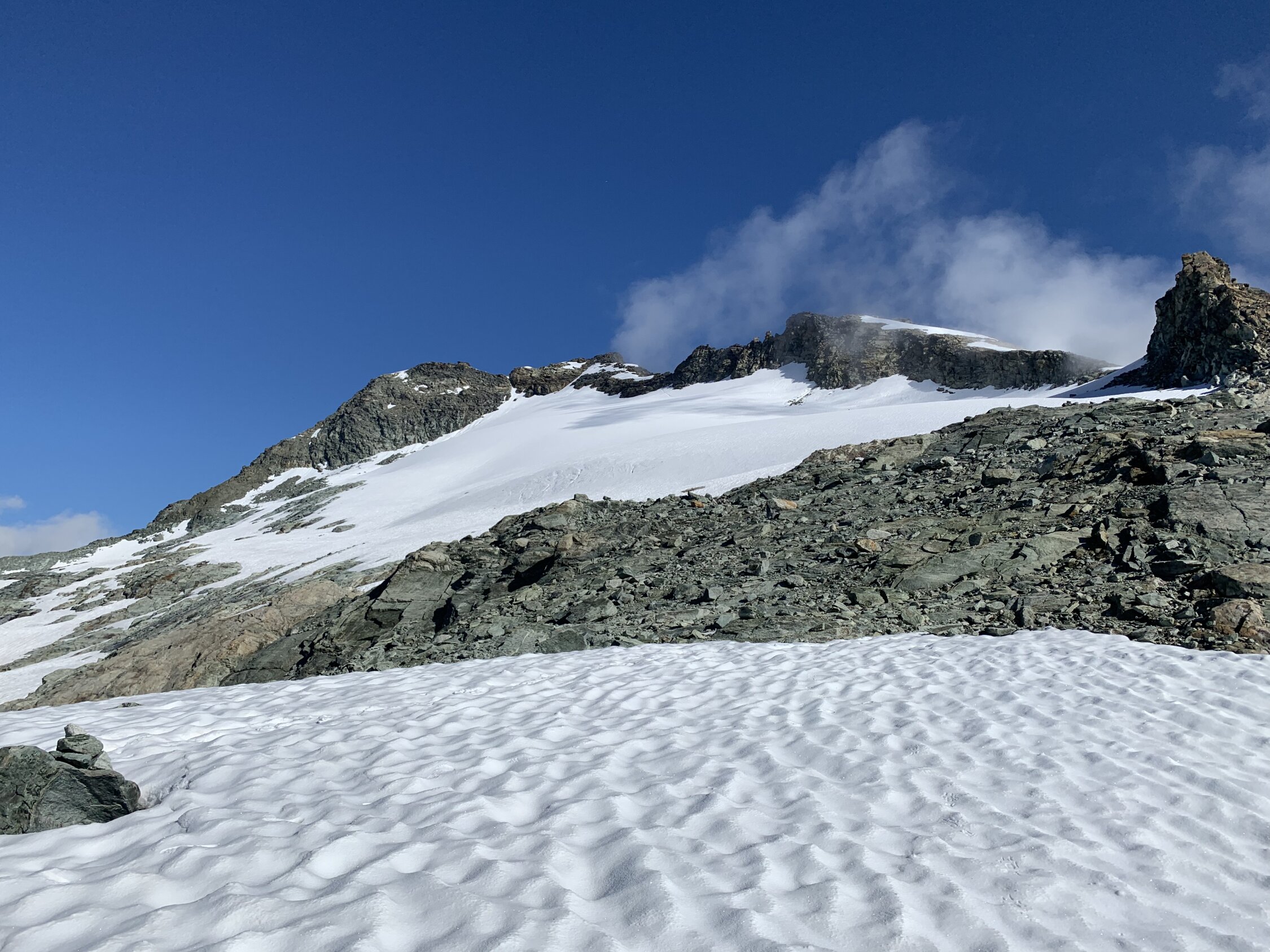 Start Mauvoisin 4 Uhr bei 6 Grad. Weg via Tunnel/Fahrstrasse nass vom Regen Vortag. Ab ca. 2600 m Geröll dann mit Raureif überzogen, unschön insbesondere im Fussbereich des Steilhangs hoch zum Col d‘Ayace. Zum Col dann gar nicht schlecht, das Geröll hält noch recht gut. Achtung, diese Variante verträgt nicht mehrere Personen, Steinschlag! Insgesamt recht frostige Angelegenheit bis zum Col. Weiter über tragenden Firn (ab 8:30 in der Sonne) und kurze Geröllabschnitte auf gute Spur (markiert mit gelben Pfeilen) hoch zum Col du Mont Gelé. Gute Spur auf tragenden Gletscher hoch zum Gipfelaufbau, gute Firnauflage mit etwas Neuschnee. Im Abstieg (11 Uhr am Col d‘Ayace) war der Reif dann bereits geschmolzen und der Fels trocken.