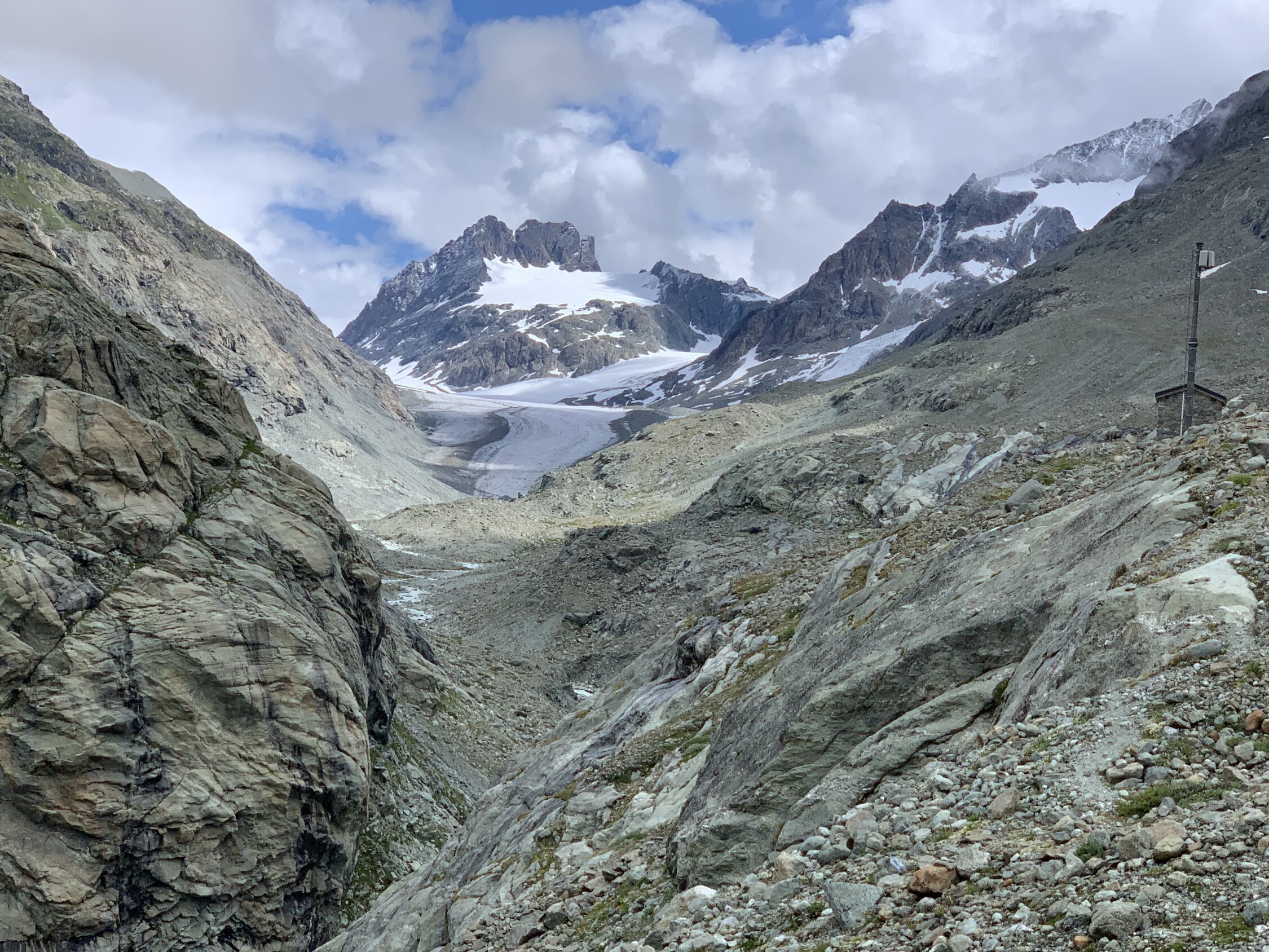 Die Tour führt über einen Gletscher - wer das solo machen möchte, muss dafür selbst Verantwortung tragen. Wer recherchiert wird in etwa genausoviele Berichte finden, wo von Spalten die Rede ist, wie Berichte, wo keinerlei Spalten gesichtet wurden (ich habe keine gesehen). Im Bereich Col dˋAyace bis Col du Mont Gelé ist Funkloch.