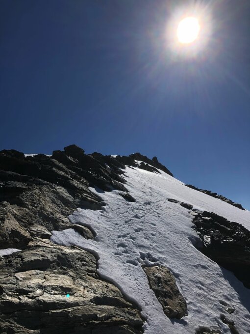 Gletscher problemlos. Grat trocken und in guter Zustand. Gipfelschnee hart und gut mit Steigeisen.